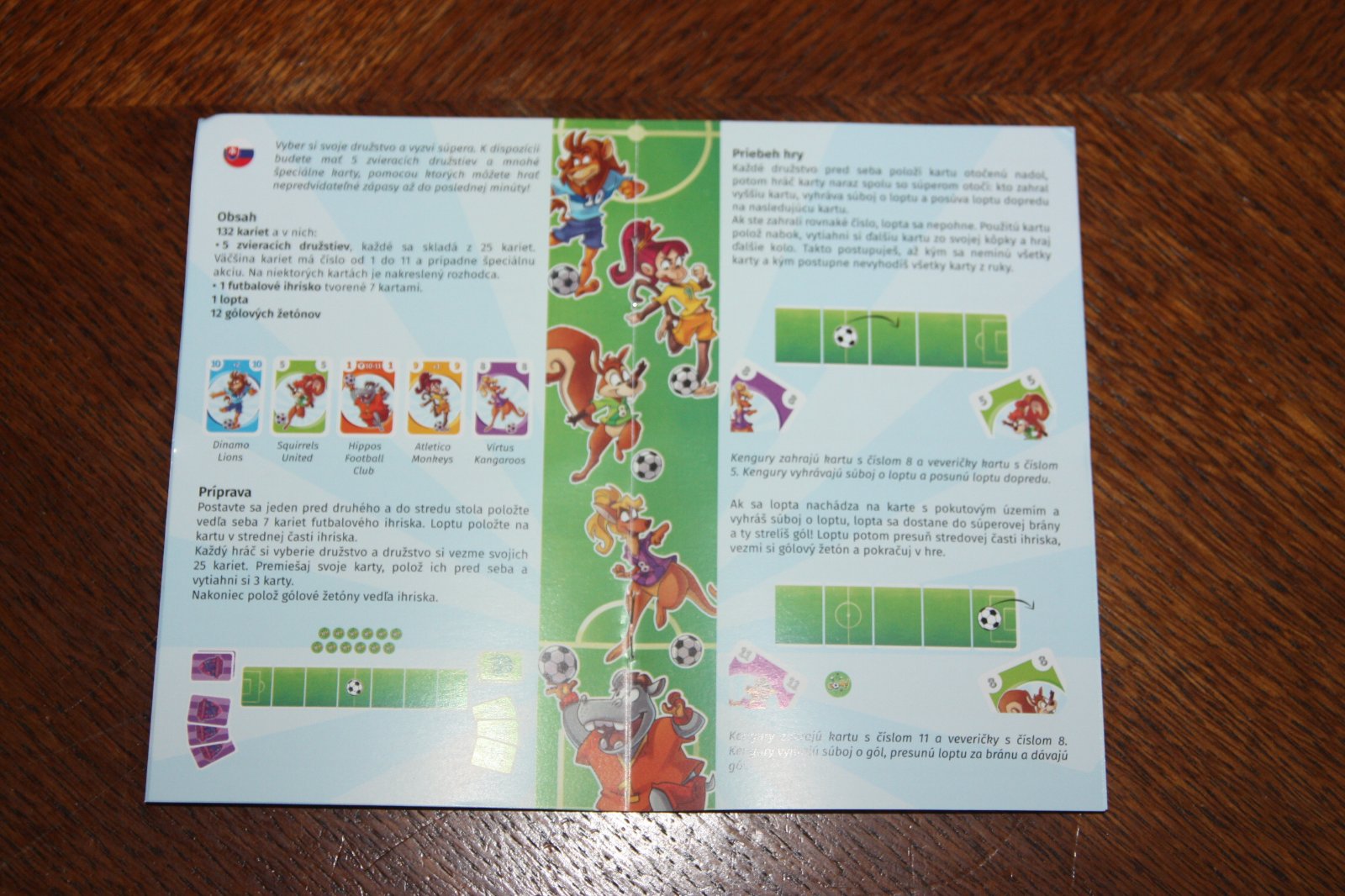 Futbalová hra ožíva v originálnom a bohato ilustrovanom balíčku 132 kariet! Každý hráč si vyberie svoj tím z Veveriek, Levov, Hrochov, Králikov a Opíc a vyzve súpera, aby s loptou postupoval po ihrisku. Každý tím má svoju vlastnú charakteristiku a špeciálne karty môžu obrátiť hru hore nohami! Kto strelí viac gólov, vyhráva. Ktorý tím v zápase zvíťazí? Súčasťou balenia je návod k hre.