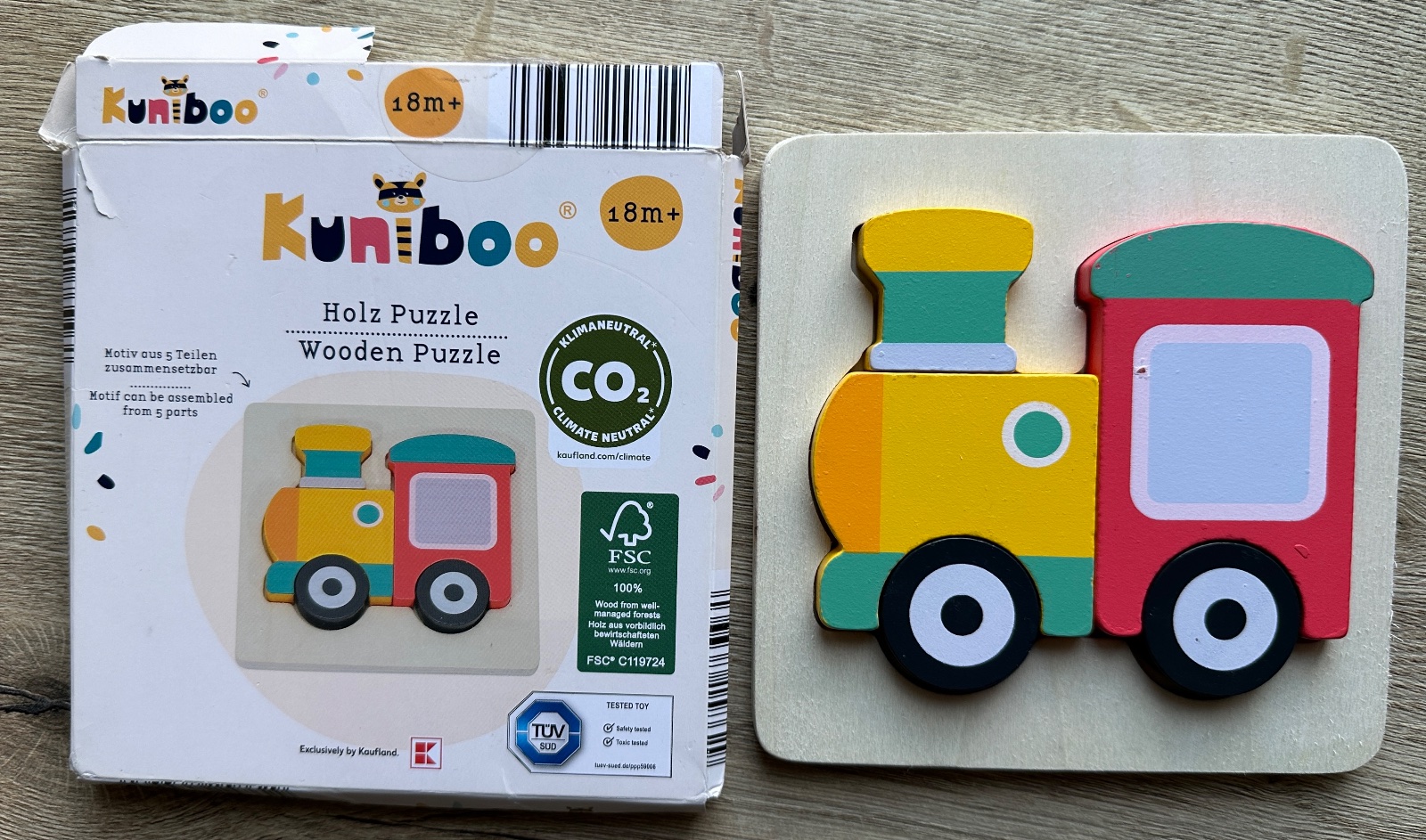 ☘️❤️Predám drevené puzzle Kuniboo – vláčik, ktorý pozostáva z 5 farebných dielikov, vhodné pre deti od 18 mesiacov.Vyrobené z dreva z udržateľných zdrojov 🌿 (FSC certifikát), bezpečné a testované (TÜV SÜD).S originál krabicou☘️❤️