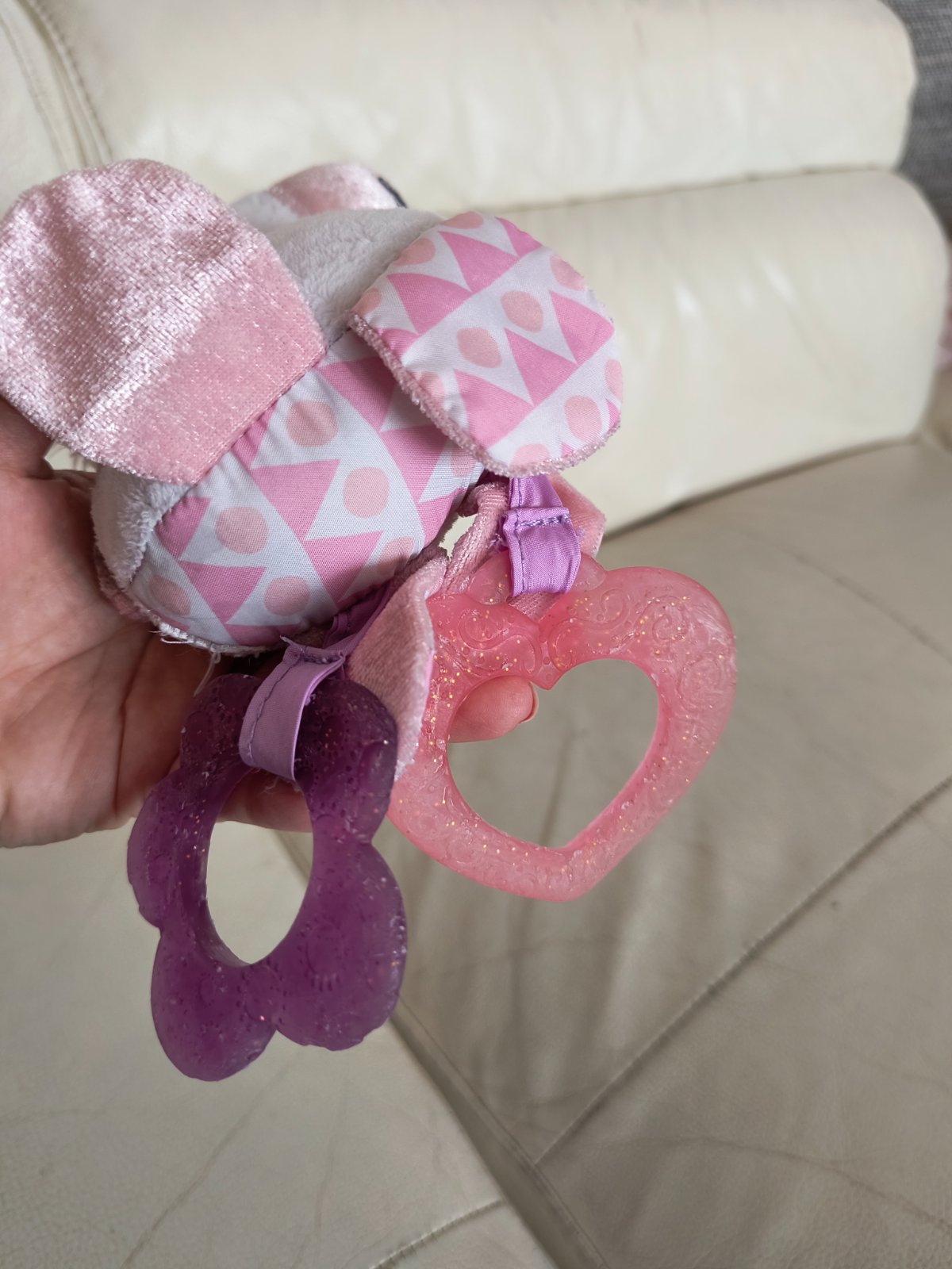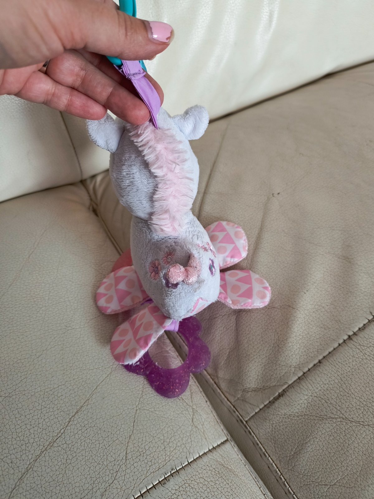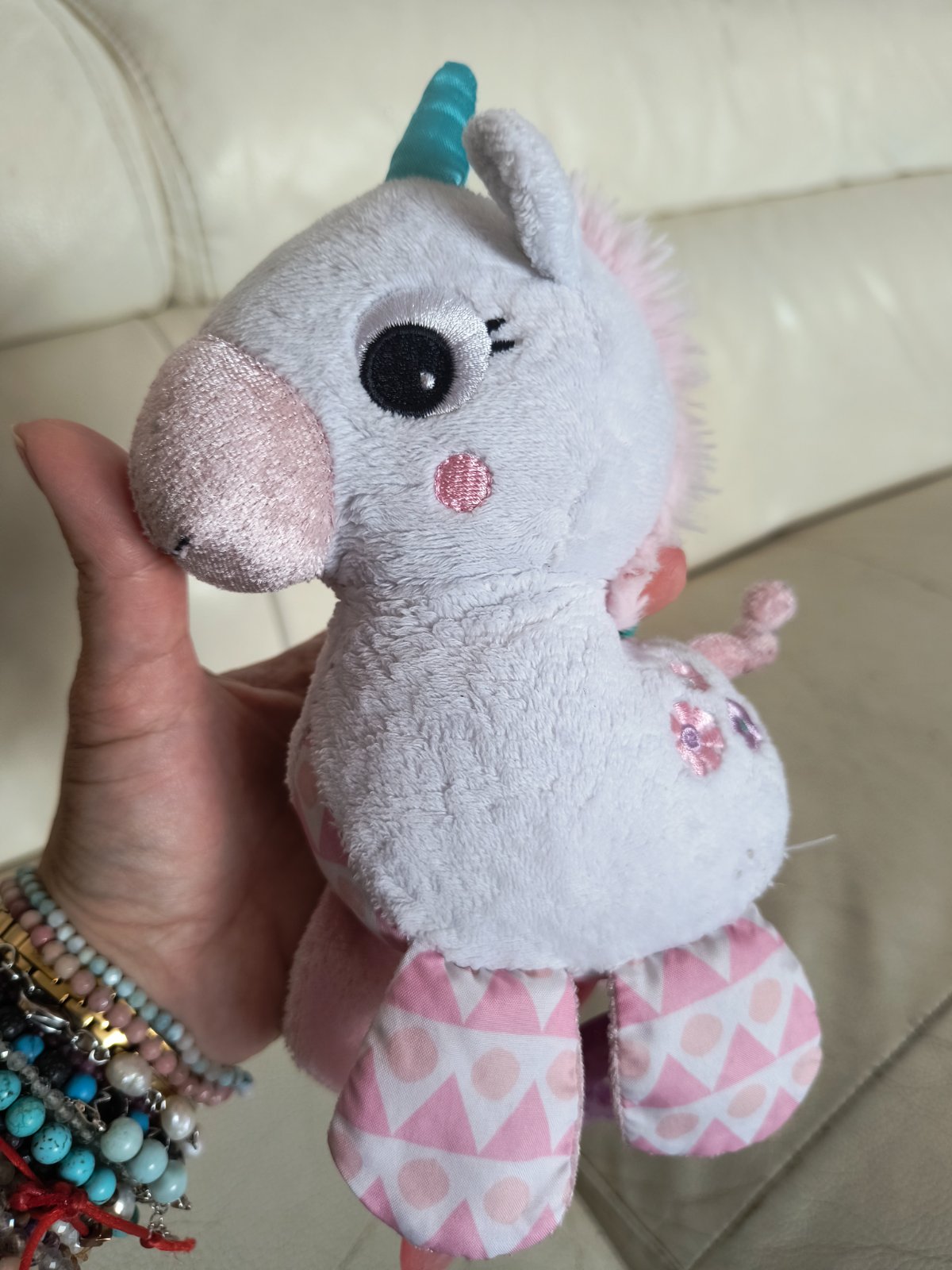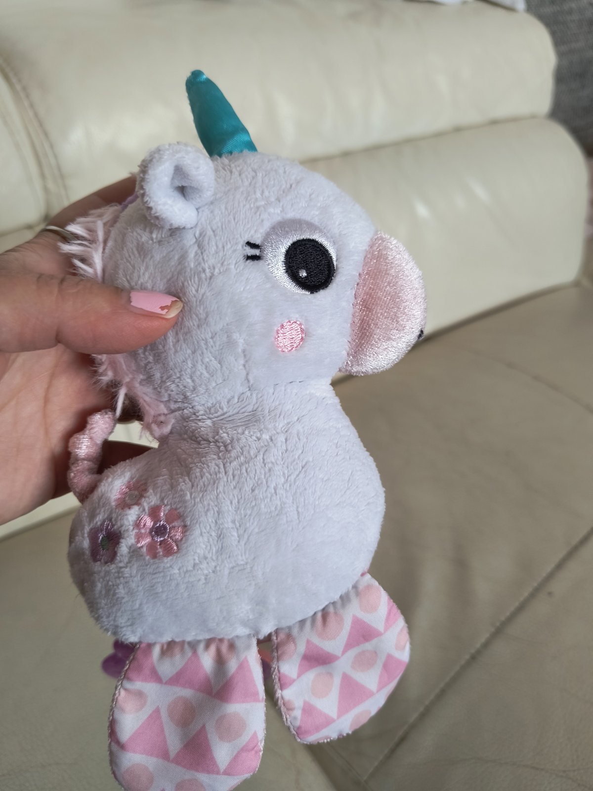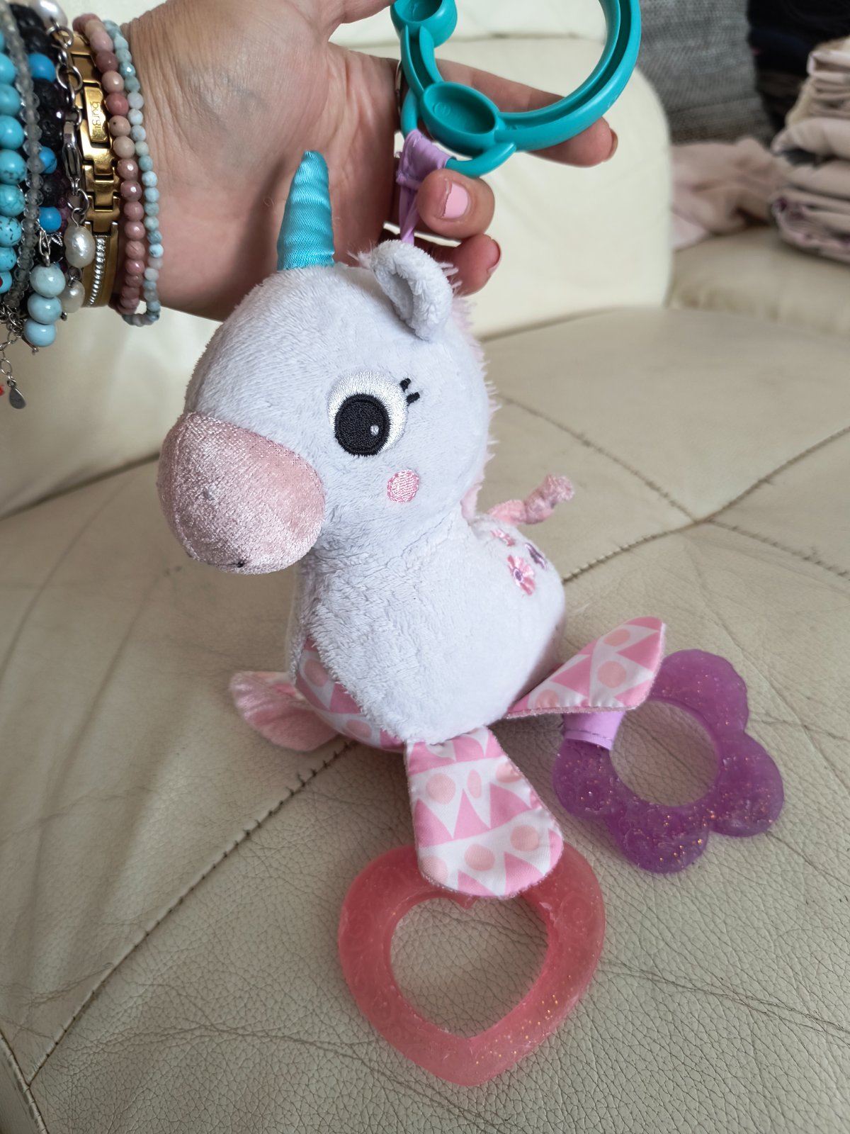 Krásny biely jednorožec nad postieľku, či do kočíka, plyšový s dvoma silikónovými hryzatkami. Bez poškodení.