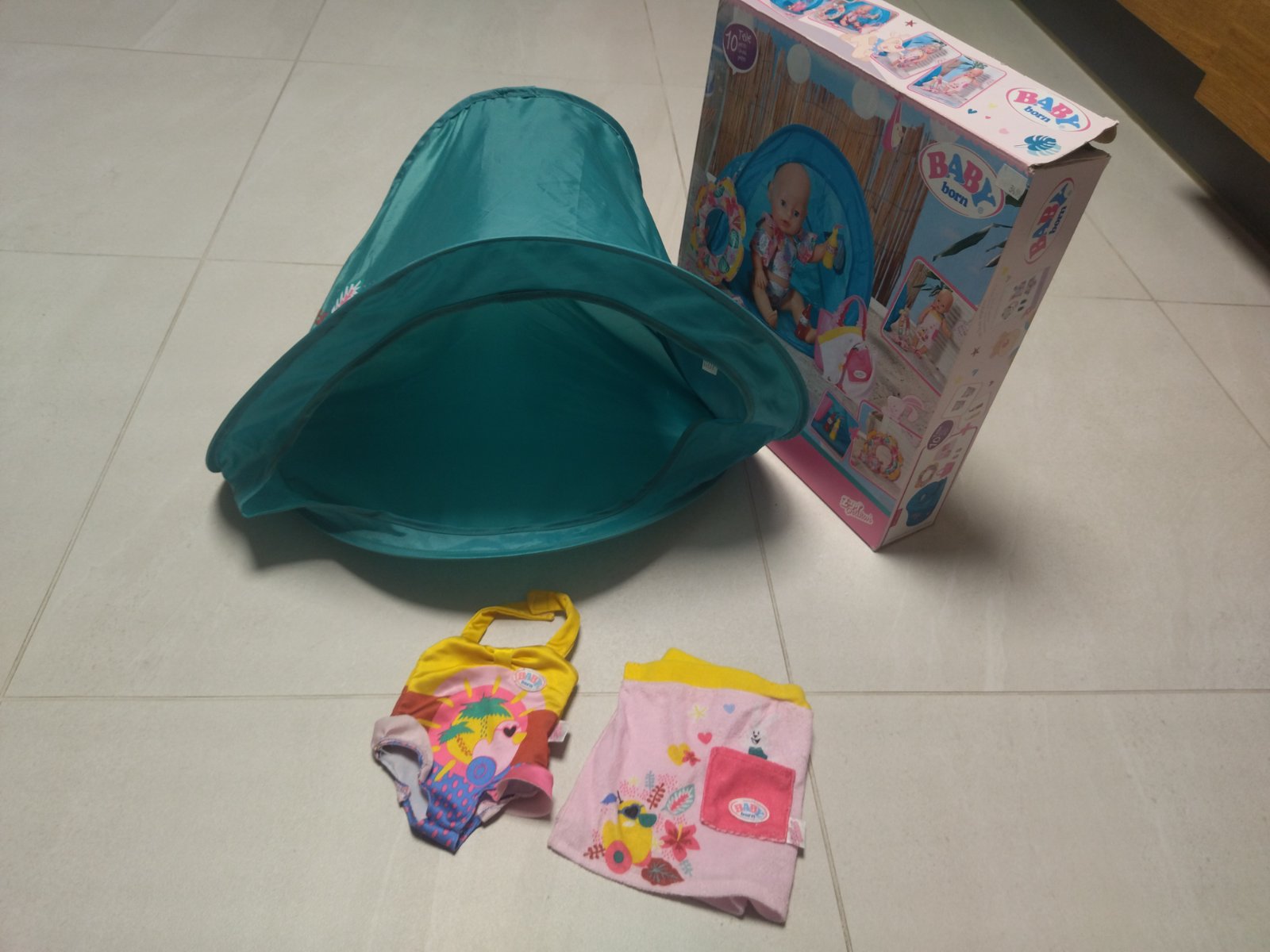 Predám plážový stan pre bábiku baby born. Vo veľmi dobrom stave. Bez poškodení. Posielam v originálnej krabici. Prikladám aj plavky pre bábiku baby born alebo inú 43 cm bábiku + plážový uterák/plážové šaty.