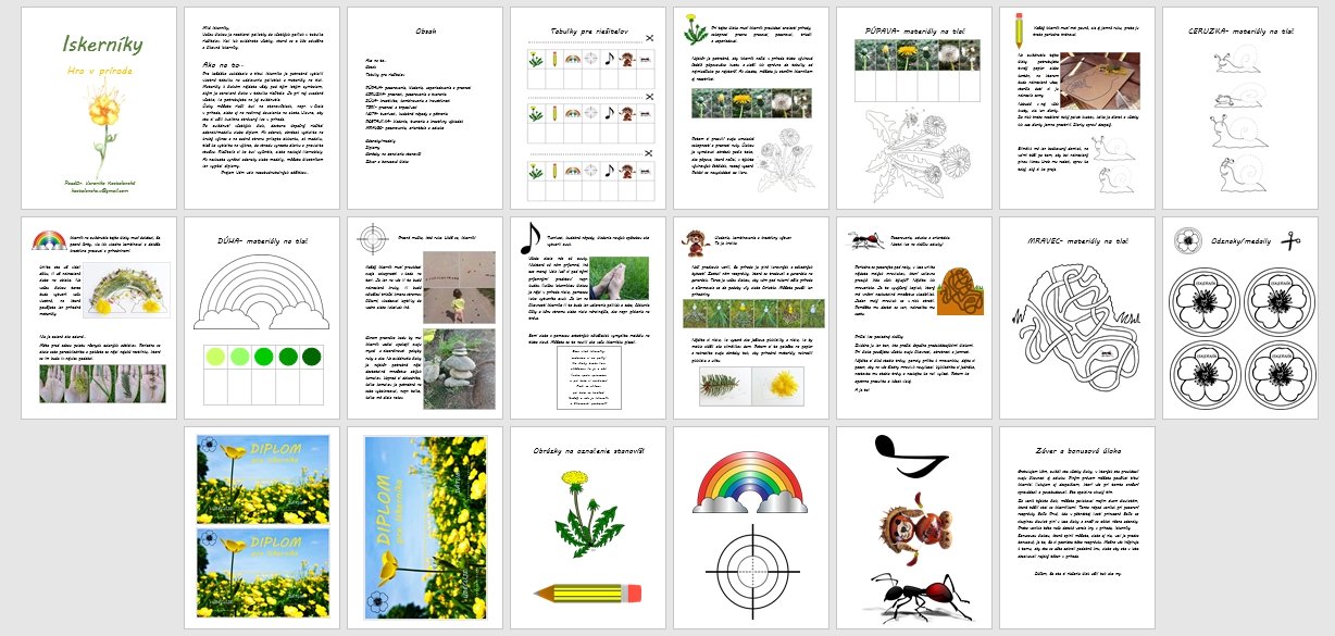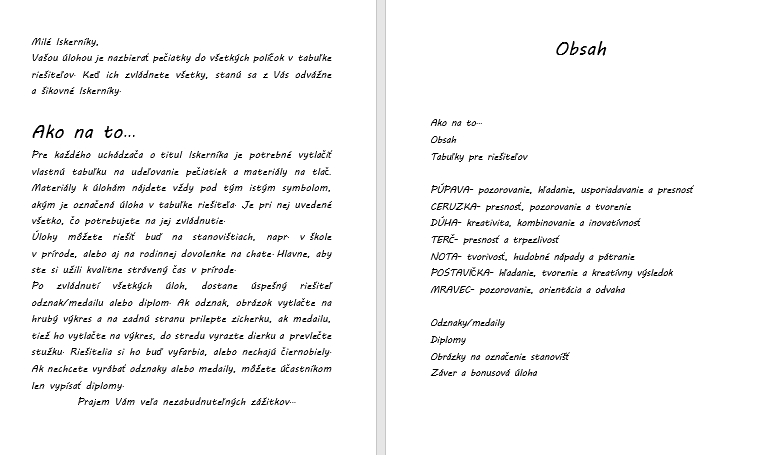 V PDF sú jednotlivé úlohy popísané a sú k nim vypracované aj materiály na tlač. Nájdete tu aj tabuľku, do ktorej si deti budú zbierať pečiatky za splnené ulohy, ale aj podklady na odznaky a hotové diplomy pre Iskerníkov.