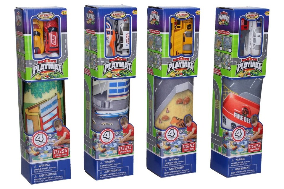 Hracia mapa s 2 dopravnými prostriedkami. Rozmery hracej mapy 70x70 cm, dopravných prostriedkov 6-8 cm. Súčasťou textilná hracia mapa, 2 kovové dopravné prostriedky.