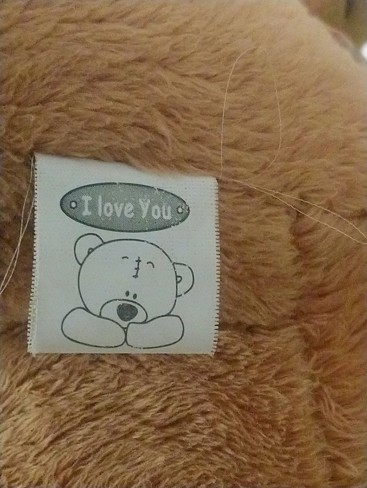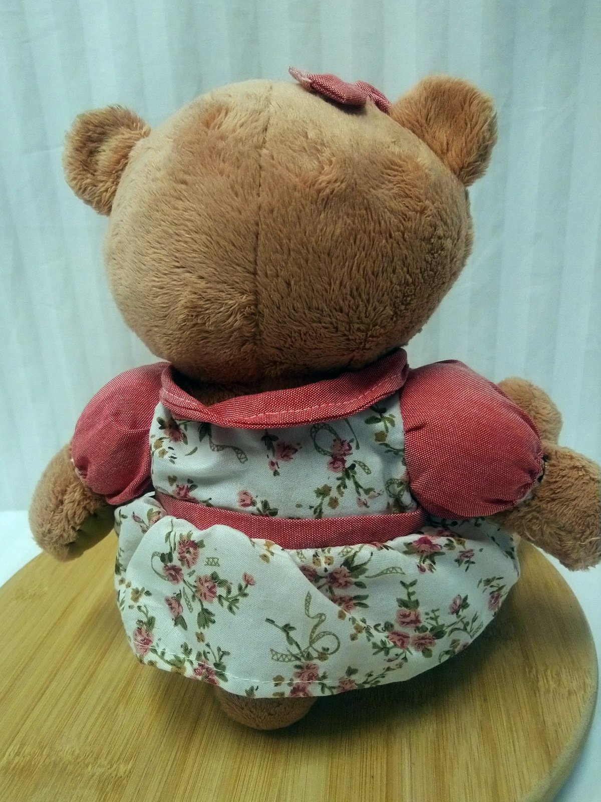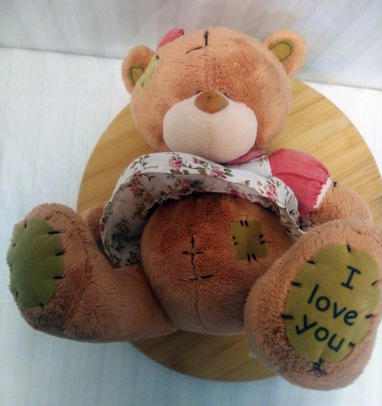 Plyšový hnedý Medveď v šatách, I love you, nápis je na labke, má mašličku na hlave, oblečený v kvetinových šatách,