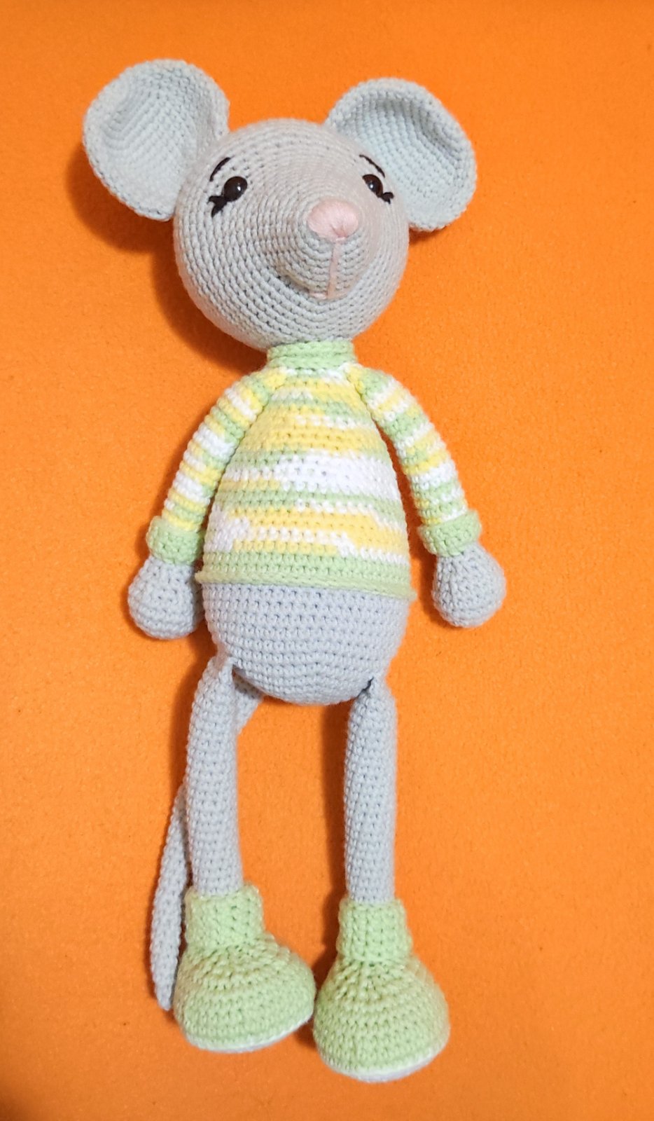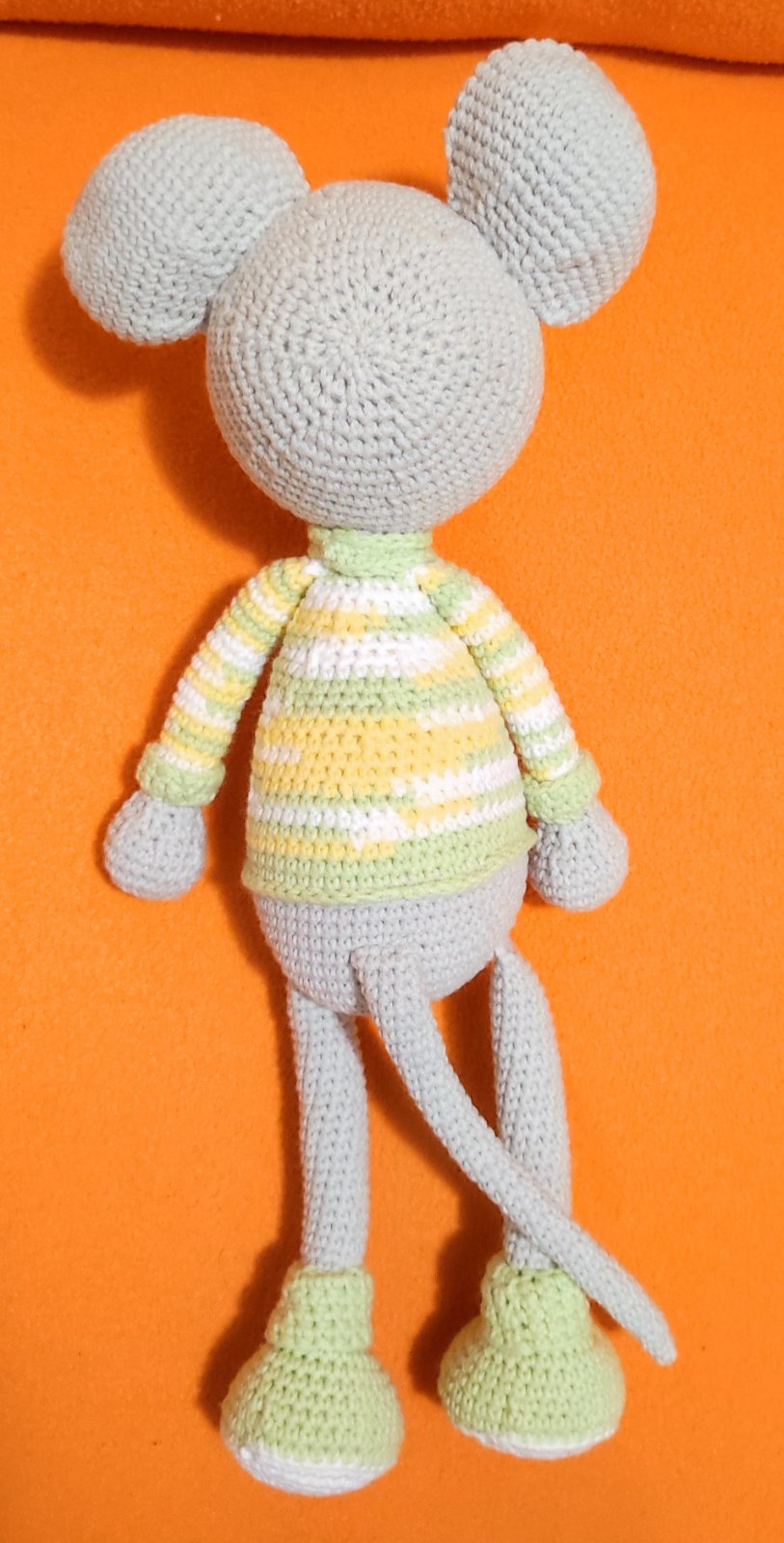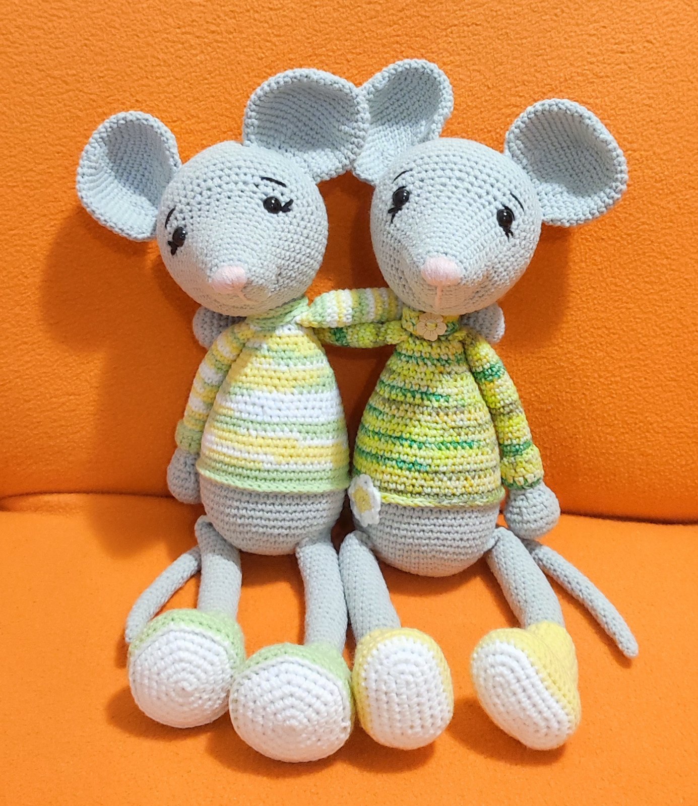 Myšky sú uháčkované z 55% bavlny a 45% akrylu, vnútro antialegicke duté vlákno, majú bezpečnoatne očká. Myška so žltými papučkami má v brušku hrkálku. Výška myšky je 35