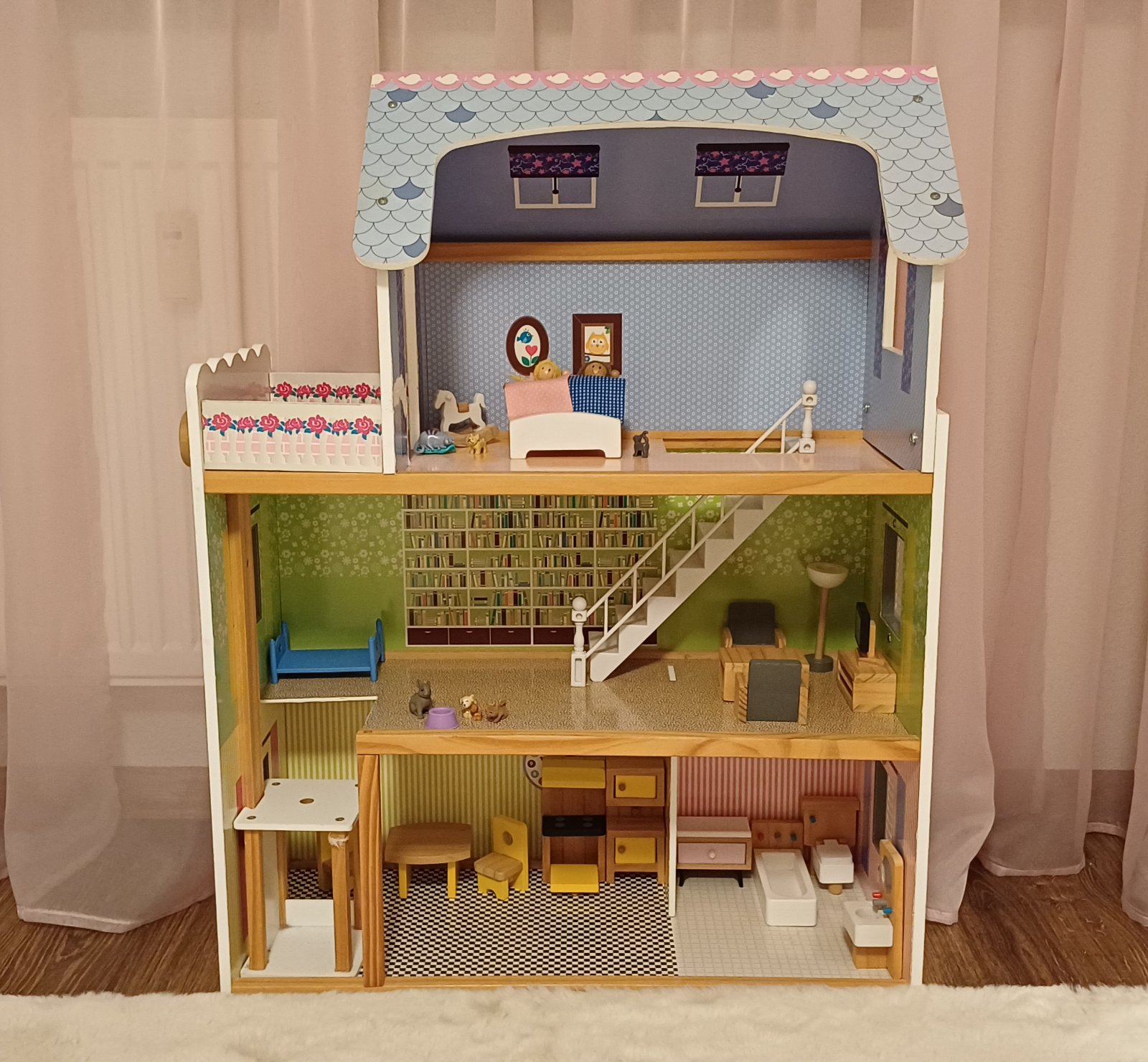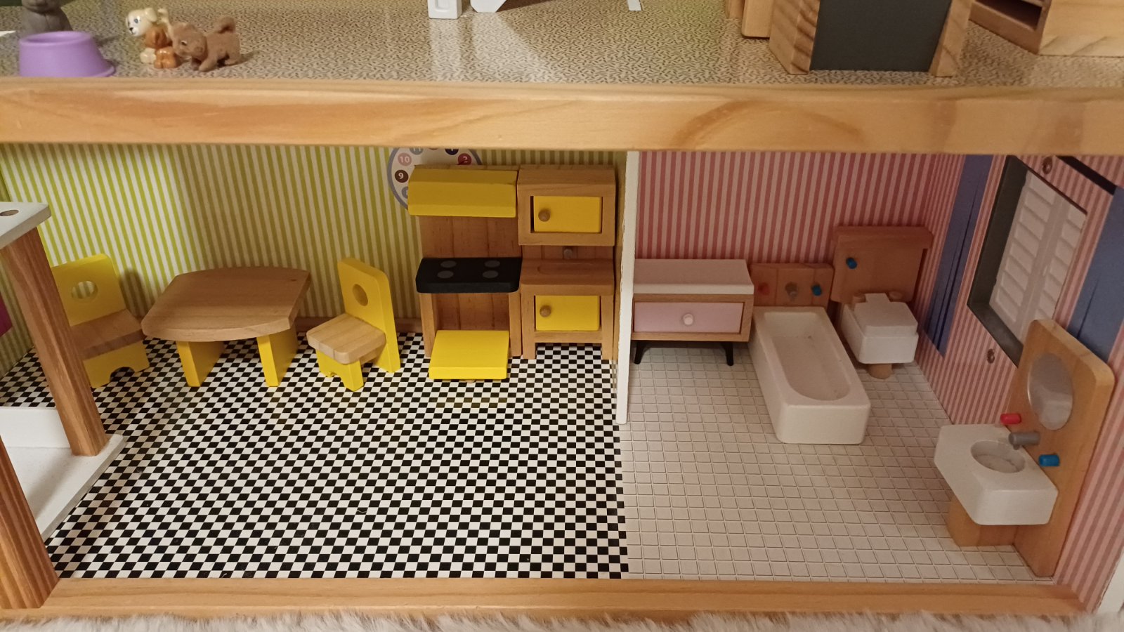 Predam krasny domcek pre babiky Small Foot v top stave. Male poskodenie na streche bolo od novoty. Sucastou je velke mnozstvo prislusenstva ako je pracka, zehliaca doska, vysavac, mop na dlazku, zv...