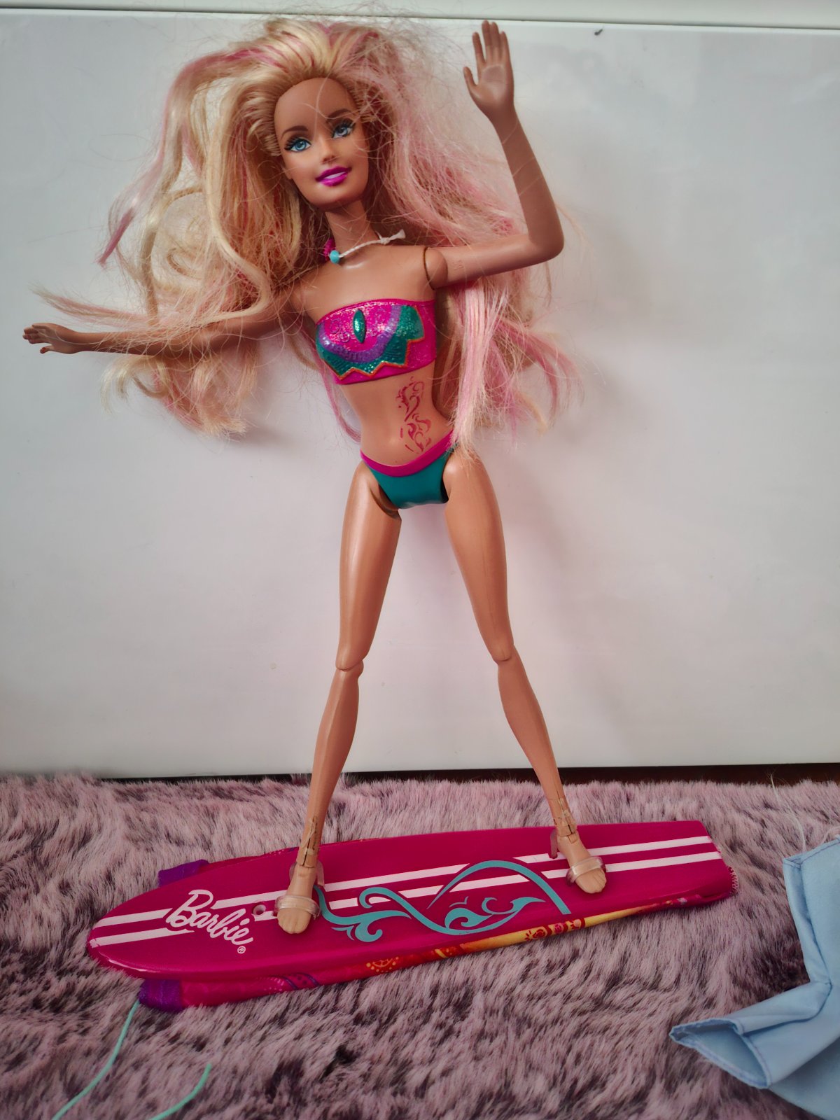 Barbie môže byť aj morská panna a pri potiahnuti šnúrky sa chvost dá schovať a je z toho surf. Barbie sa dajú nastoknut nohy na surf.