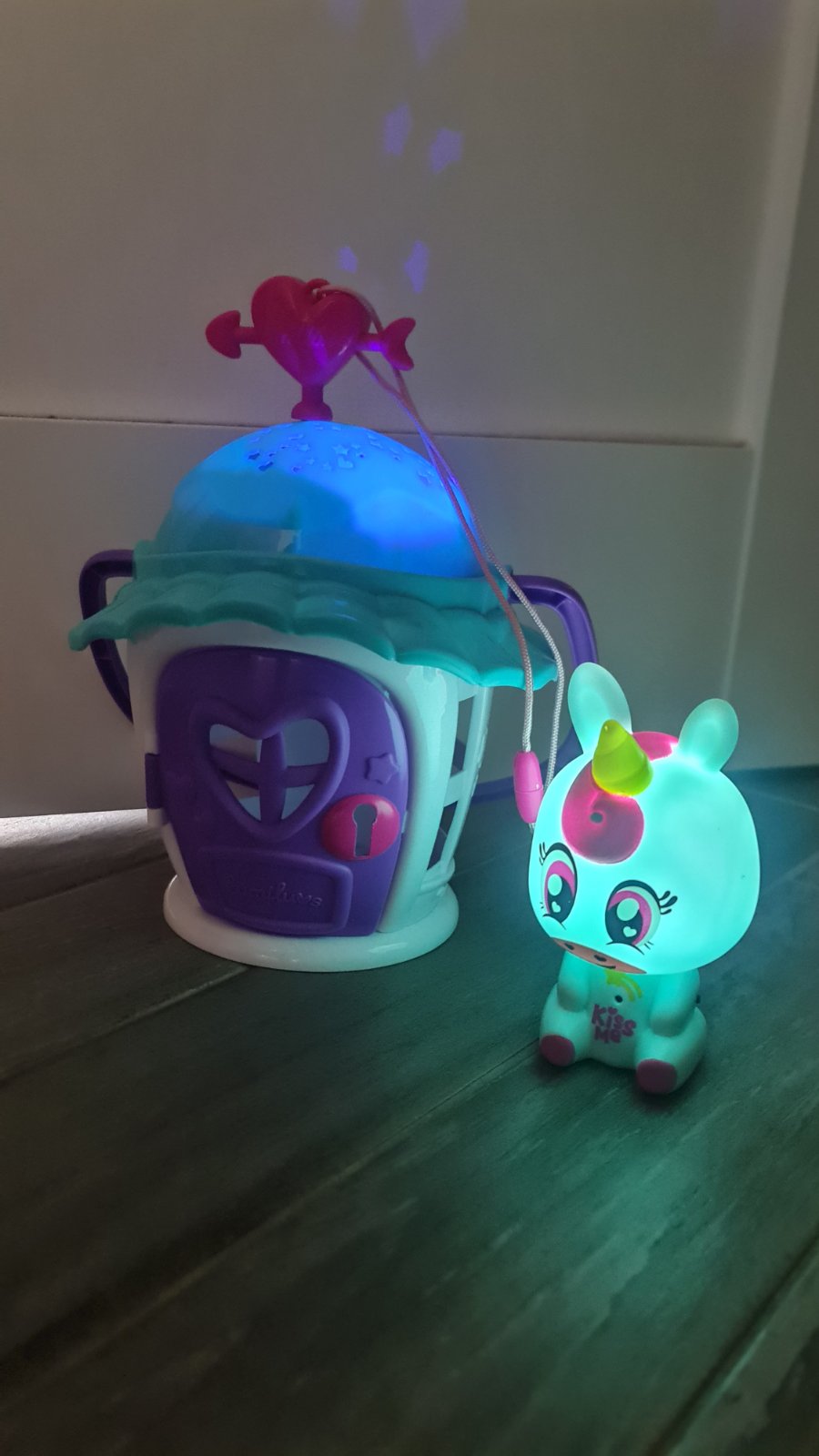 Domček svieti a premieta farebne vzory na strop. Jednorožec svieti a vydáva zvuk po fúknutí na bruško a pusinke. Domček sa po 10 minútach sám vypne.