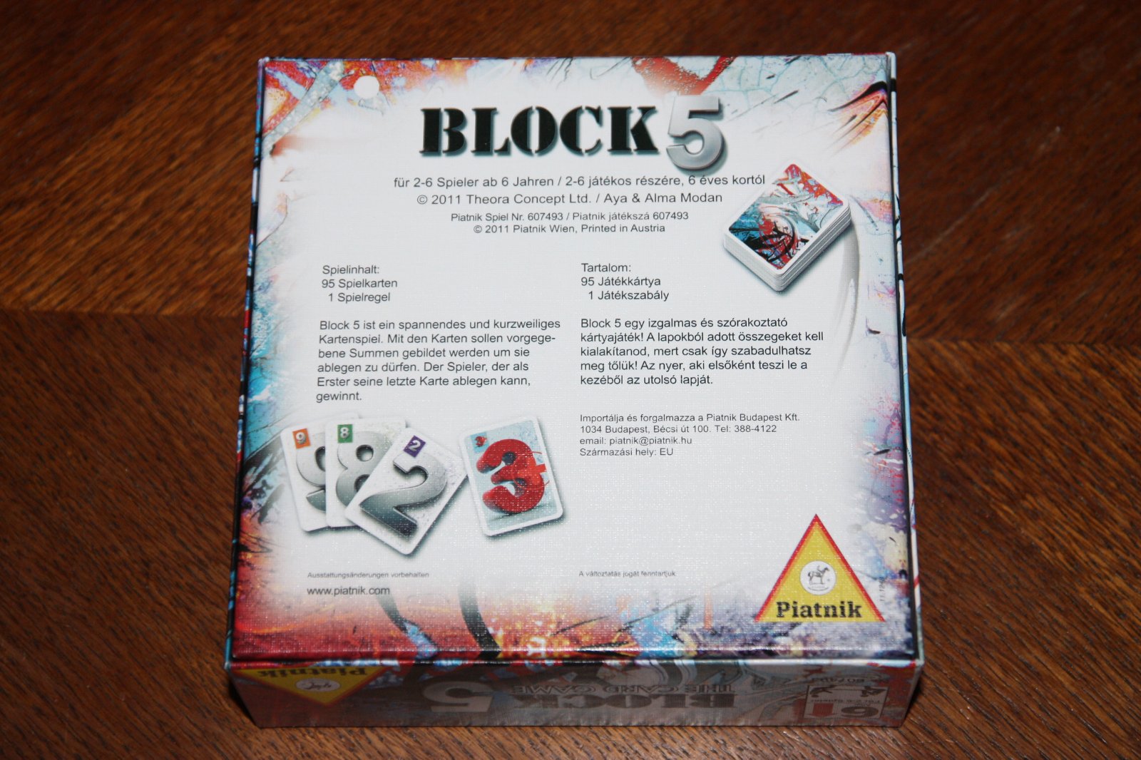 Blok 5 je vzrušující a zábavná karetní hra. Pomocí karet hráči sestavují požadovaný součet. Hráč, který své karty vyloží na stůl ve vhodných kombinacích jako první, vyhrává.