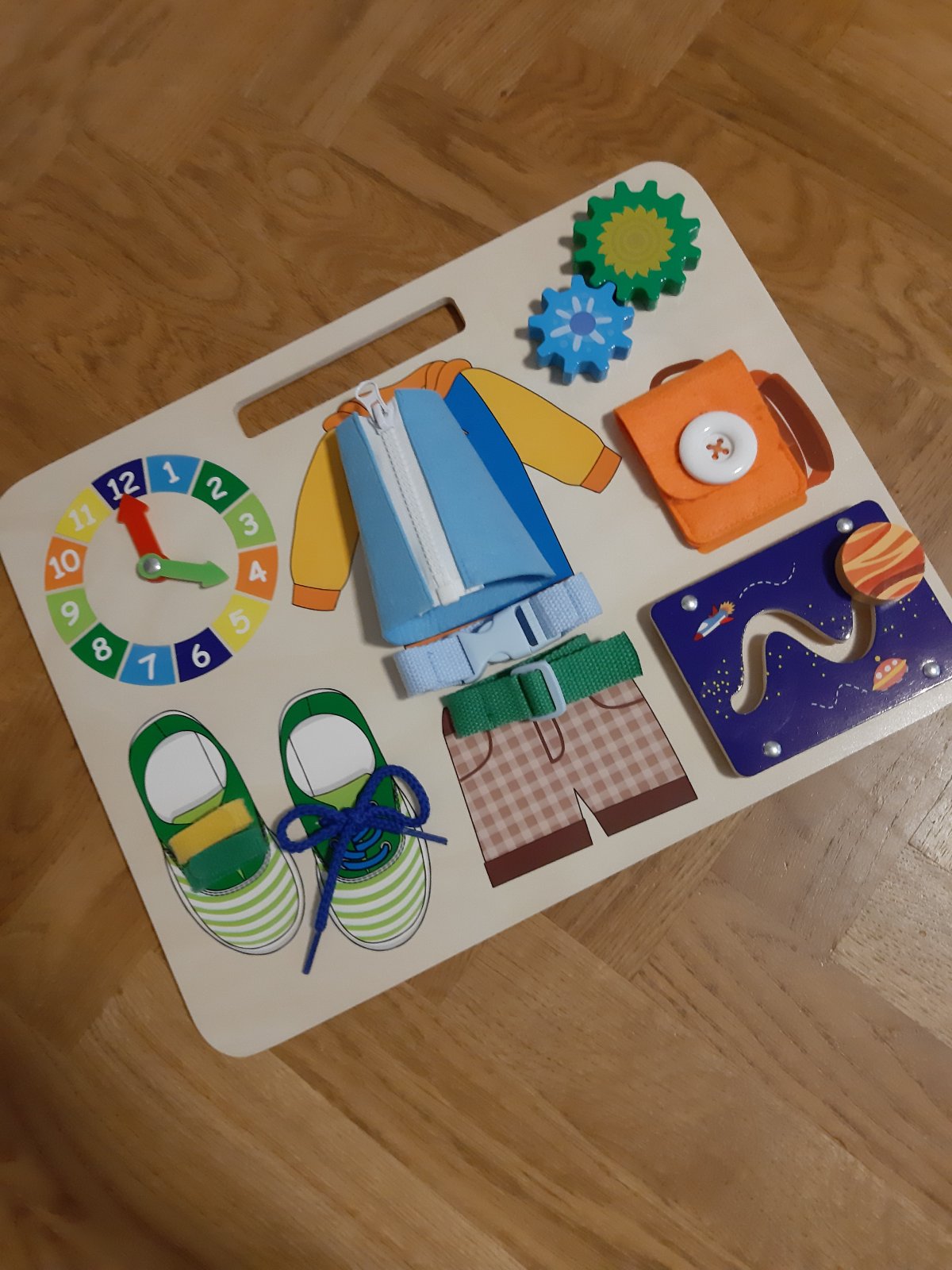 Z pravého dreva. Hravým spôsobom podporuje senzoriku a manipuláciu s tvarmi a materiálmi. Dieťa sa veľa naučí a všetko preskúma: ozubené kolesá, pracka na opasok, gombík, šnúrky, zipsy, hodiny, posuvný labyrint. Vhodné pre deti od 1 roku. Rozmery cca 38 x 29,2 x 0,87 cm