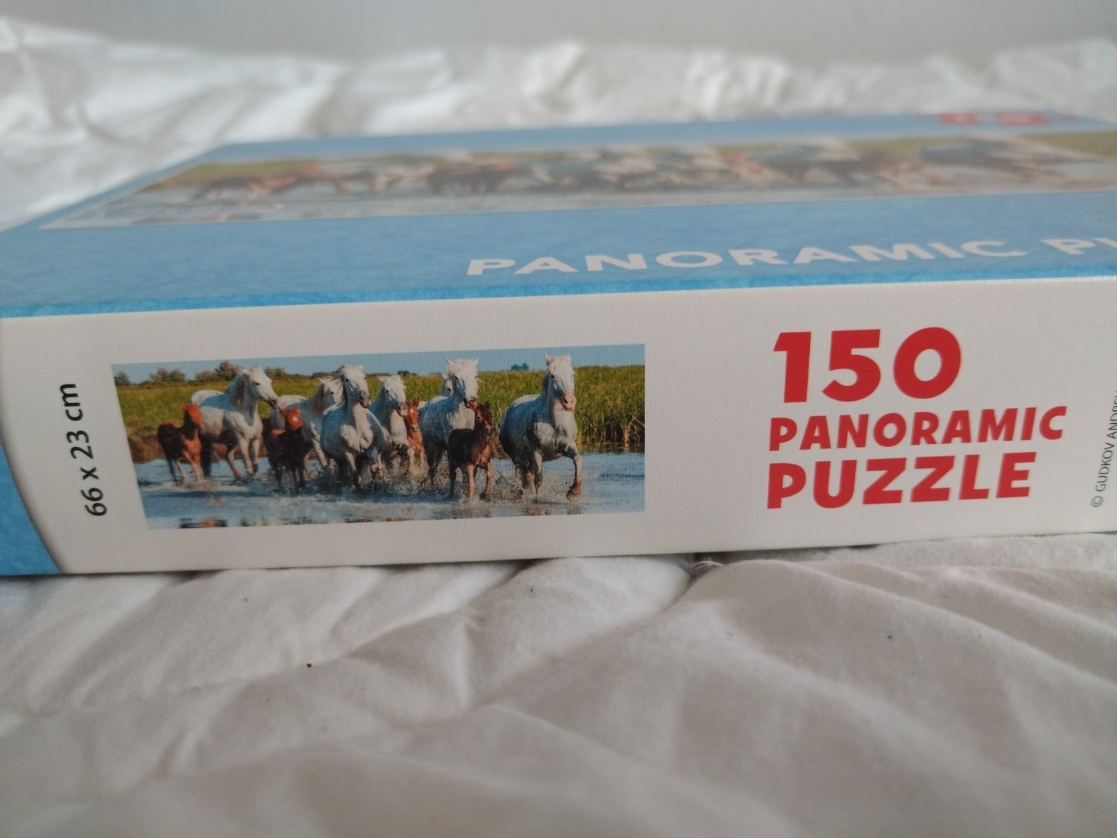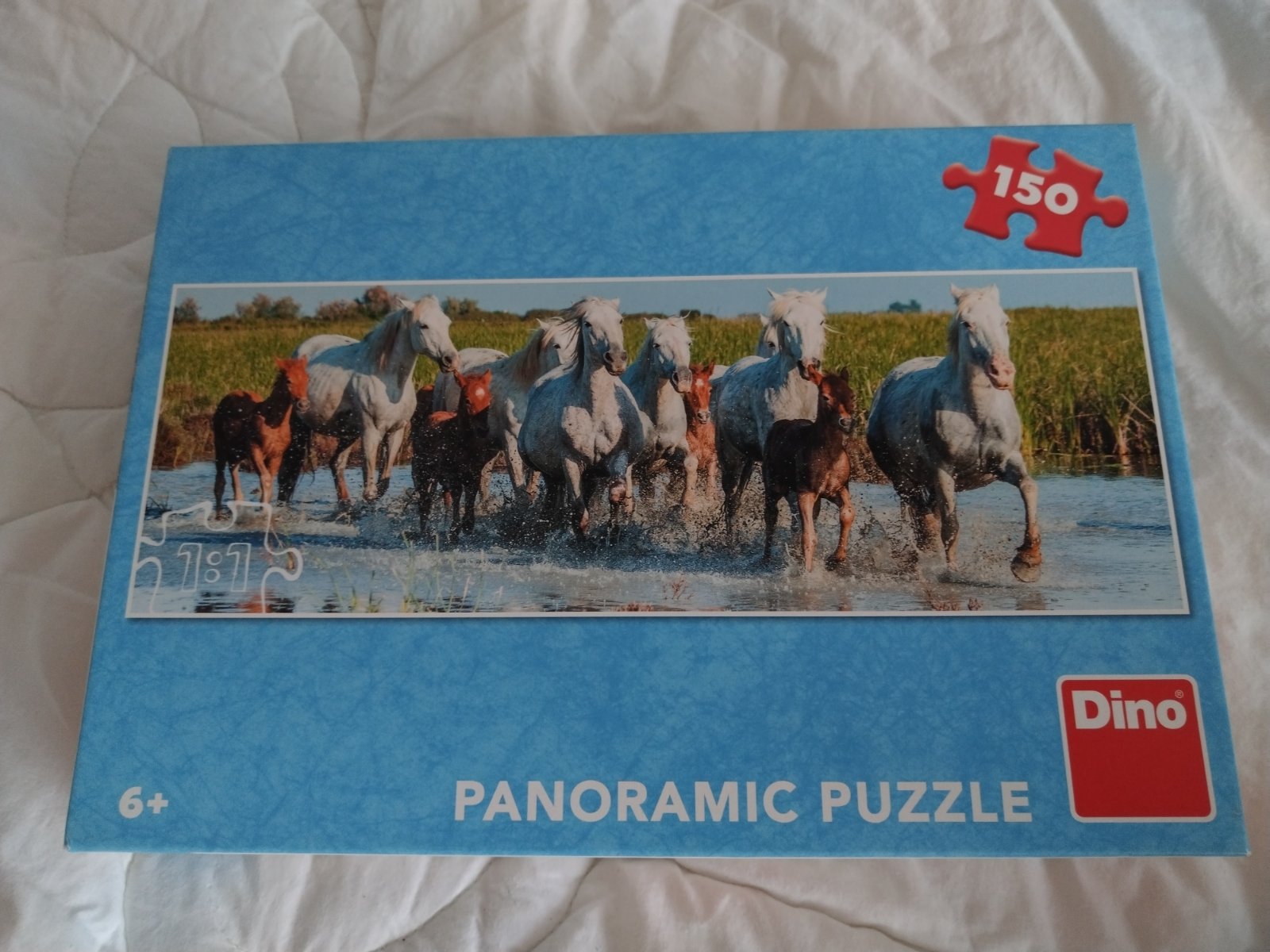 PUZZLE OBSAHUJÚCE 150 dielikov s motívom koňov, panoramatický tvar, nové, nepoužité.
