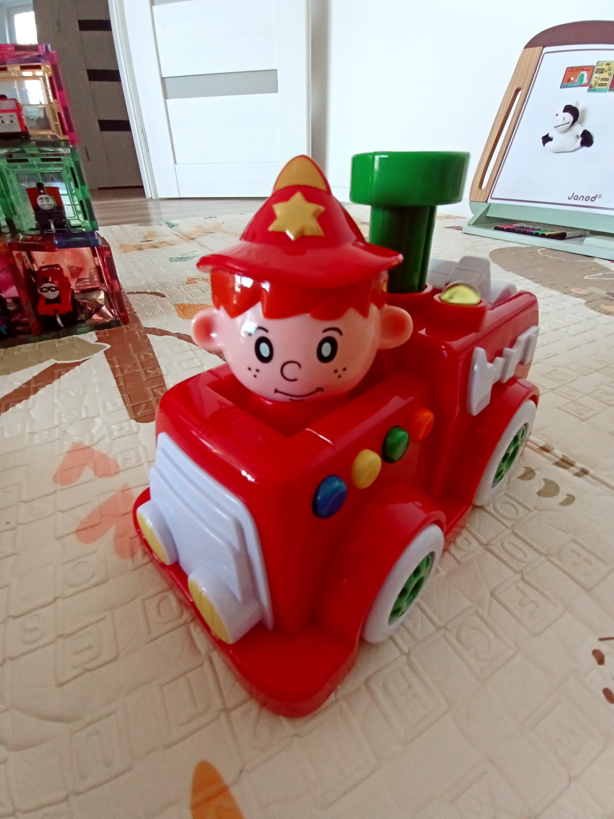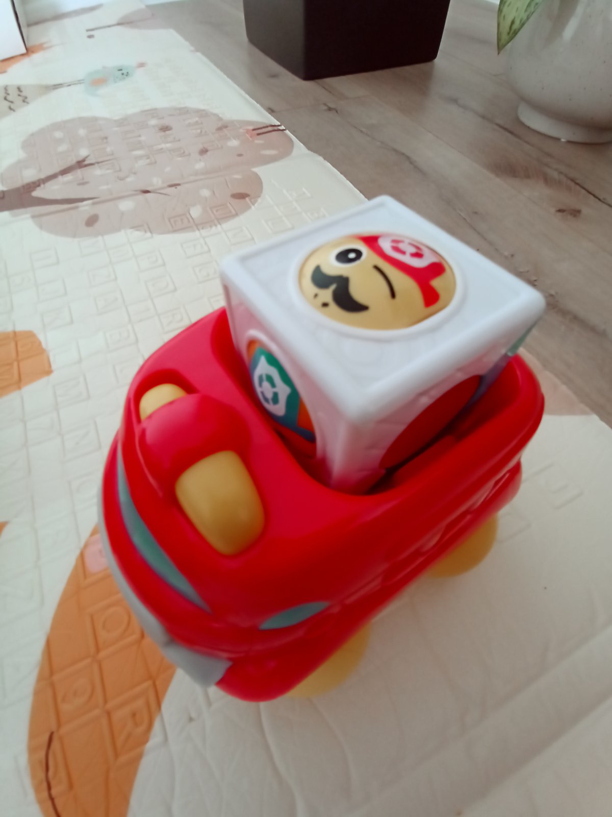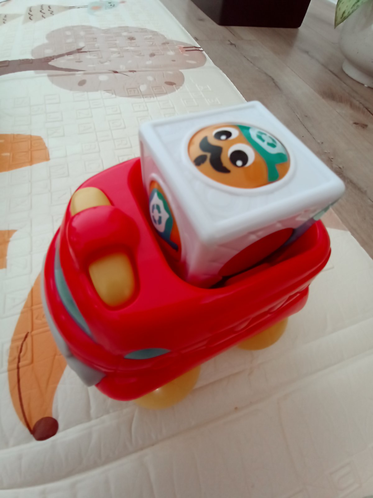 Všetky plne funkčné. Hasičské auto s rôznymi zvukmi a melódiami, plus naťahovacie. Vláčik tiež vydáva zvuky pri pohybe, dotyku. Autíčko s kockou - tvár v kocke sa pri pohybe autíčka točí.