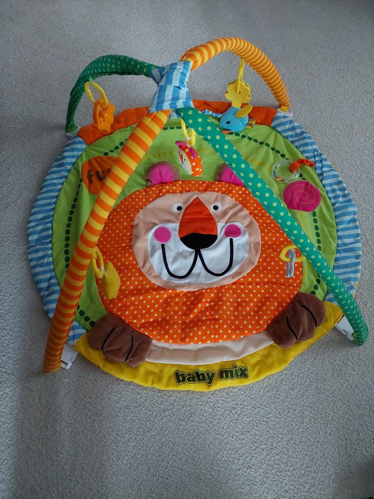 Predam detsku hrazdicku na hranie. Prvky na hranie ako hrkalky, sustave predmery, hryzatko, piskatko ( nos velkeho leva), a pre nas najzaujimavejsia aktivita z celej hrazdicky-vyrobny stitok 😀 . Je zachovaly, nema ziadne poskodenia, bez , bez dier. 2 mini chybičky co som nasla su nafotene - kaz na zelenej hrazdicke, to je tam ale uz od vyroby, nic sas tym nedeje, drzi to, nepara sa to. A potom ja som zasivala male rozpravanie vo šve na vtacikovi. Inak bez chyby.
