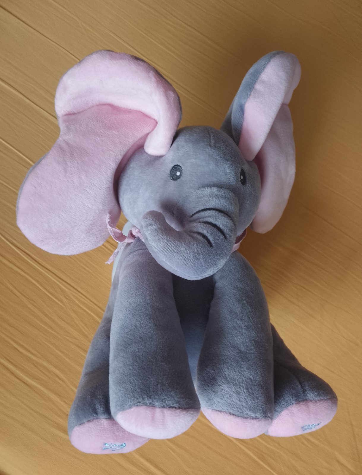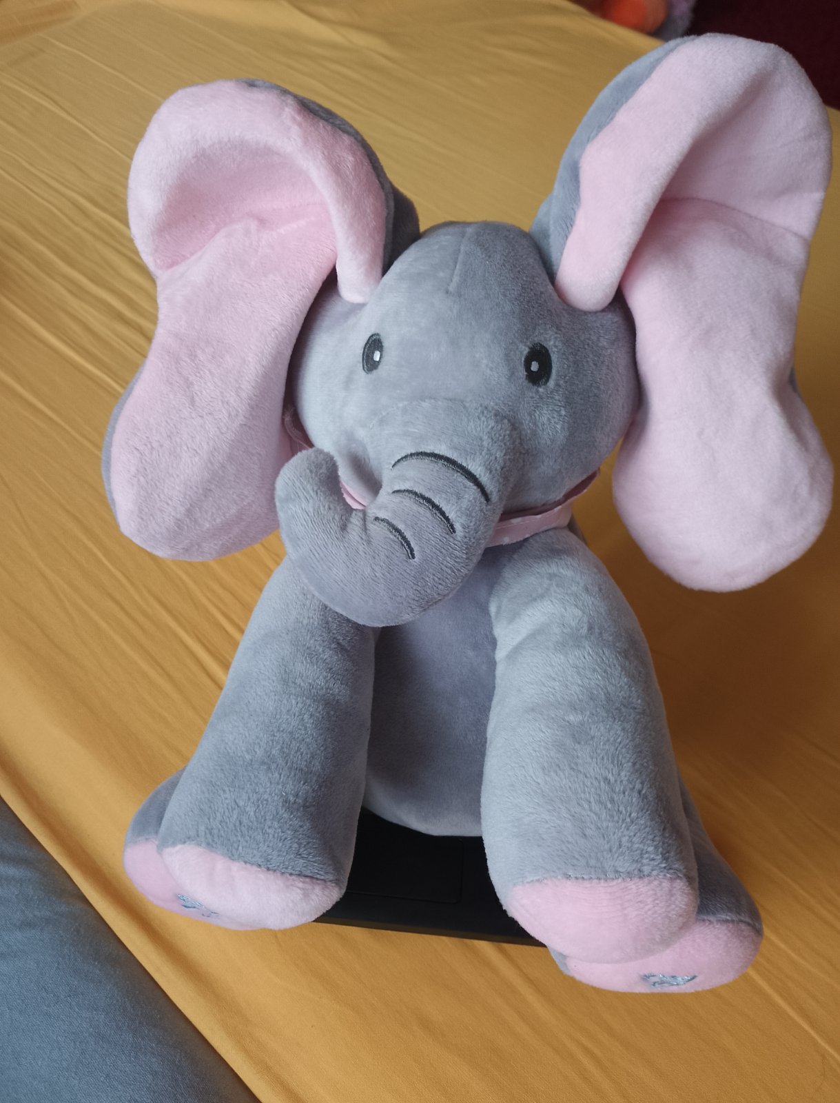 Slon hrá,spieva a hýbe ušami(zakrýva si nimi tvár). Piesne sú v angličtine.