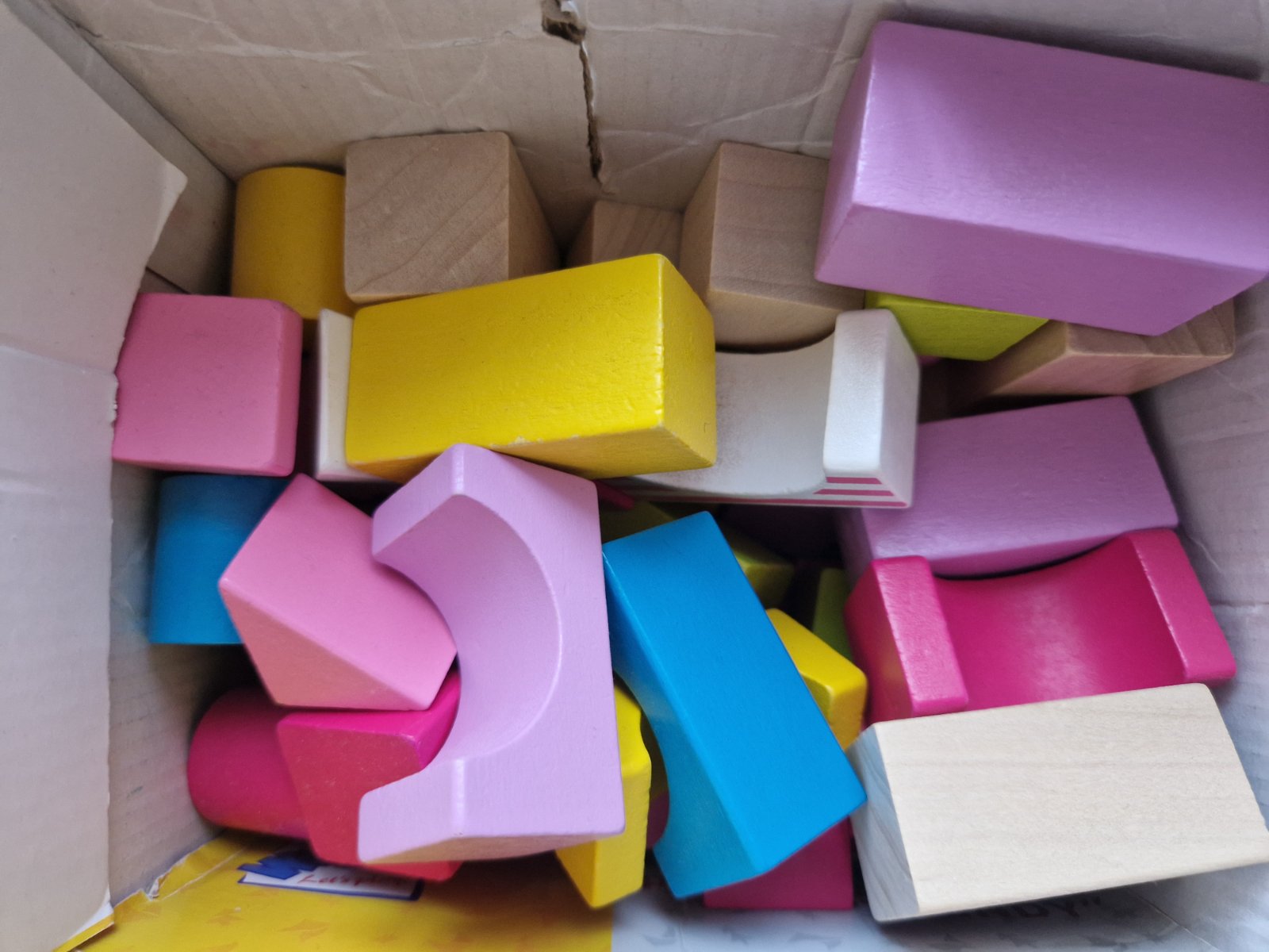 Hrana, krabica zvrchu trochu flakata. 72 drevenych dielikov, 37 klincekov
