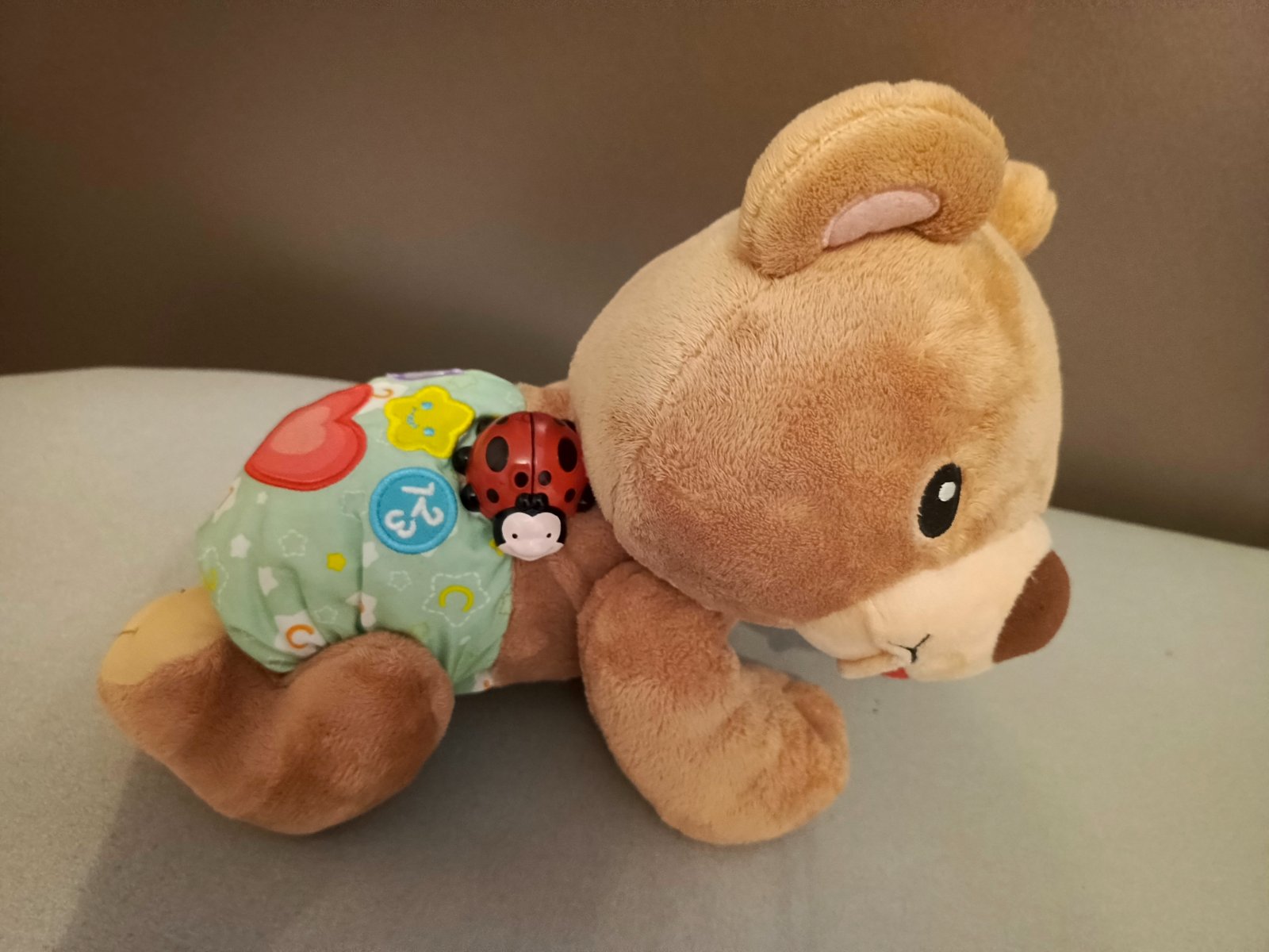 Značka Fisher price. Hrá upokojujúce melódie, bruško sa pohybuje hore dole, lampa svieti, hračka dýcha, bije mu srdiečko. Toto všetko sa dá zvlášť vypínať podľa potreby. Super pomôcka na zaspávani...
