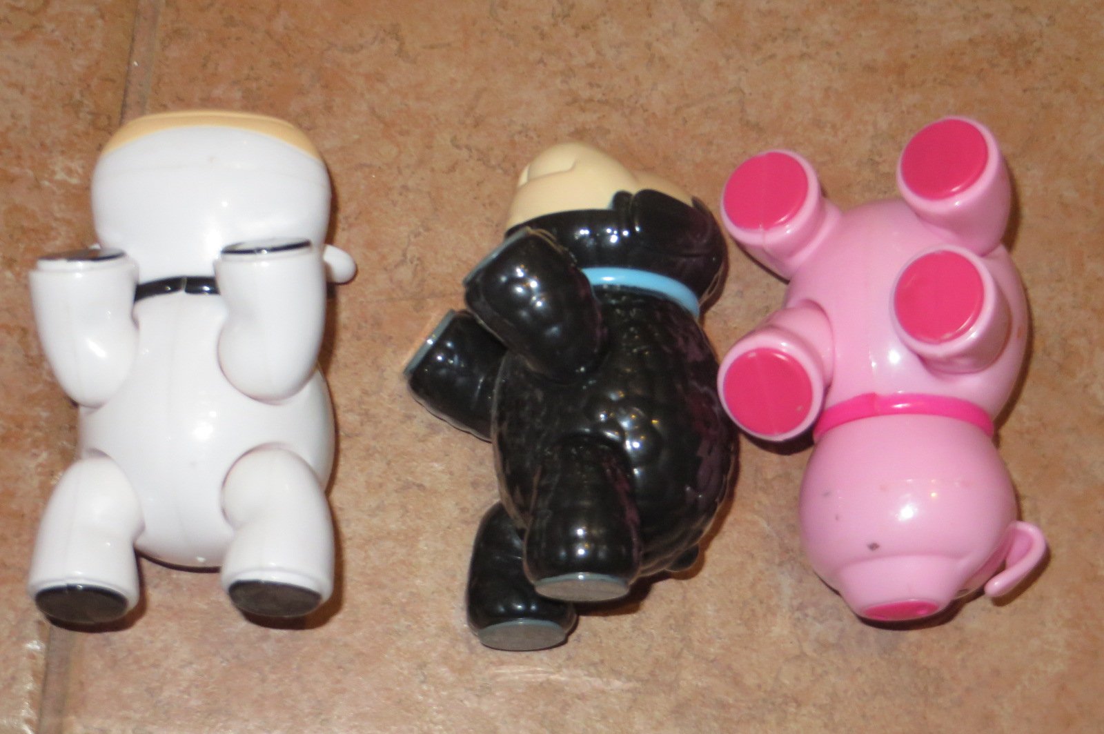 Predám tieto tri hrané zvieratká, vhodné pre najmenších. Dajú sa im otáčať hlavy a hýbať s nohami, rozmer je: dĺžka 10 cm, šírka 6,5 cm. Vhodné sú teda pre najmenšie rúčky, nehrozí, že si dieťa ublíži. Veľmi sme sa s nimi vyhrali. Najlepšie odber spolu.