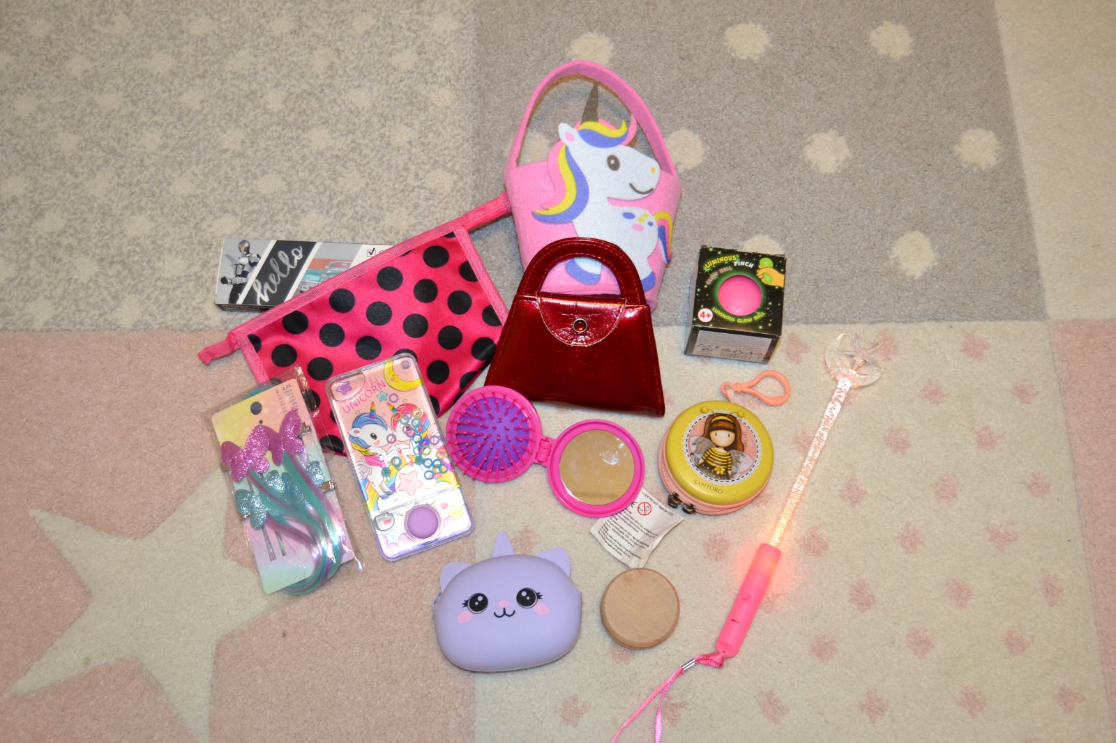 Obsahuje kabelka, košík, sponky, fixa, svietiaca palička, hrebeň, peňaženka, hra, jojo , ai ..