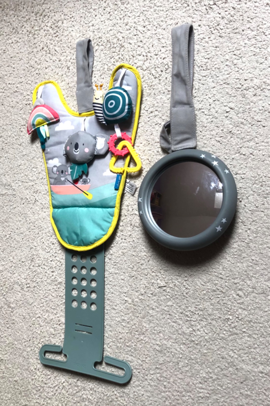 sHrací pultík so zavesenými hračkami zabaví počas jazdy dieťa sediace v autosedačke proti smeru jazdy. Spätné zrkadlo umožňuje rodičovi dieťa sledovať počas jazdy.