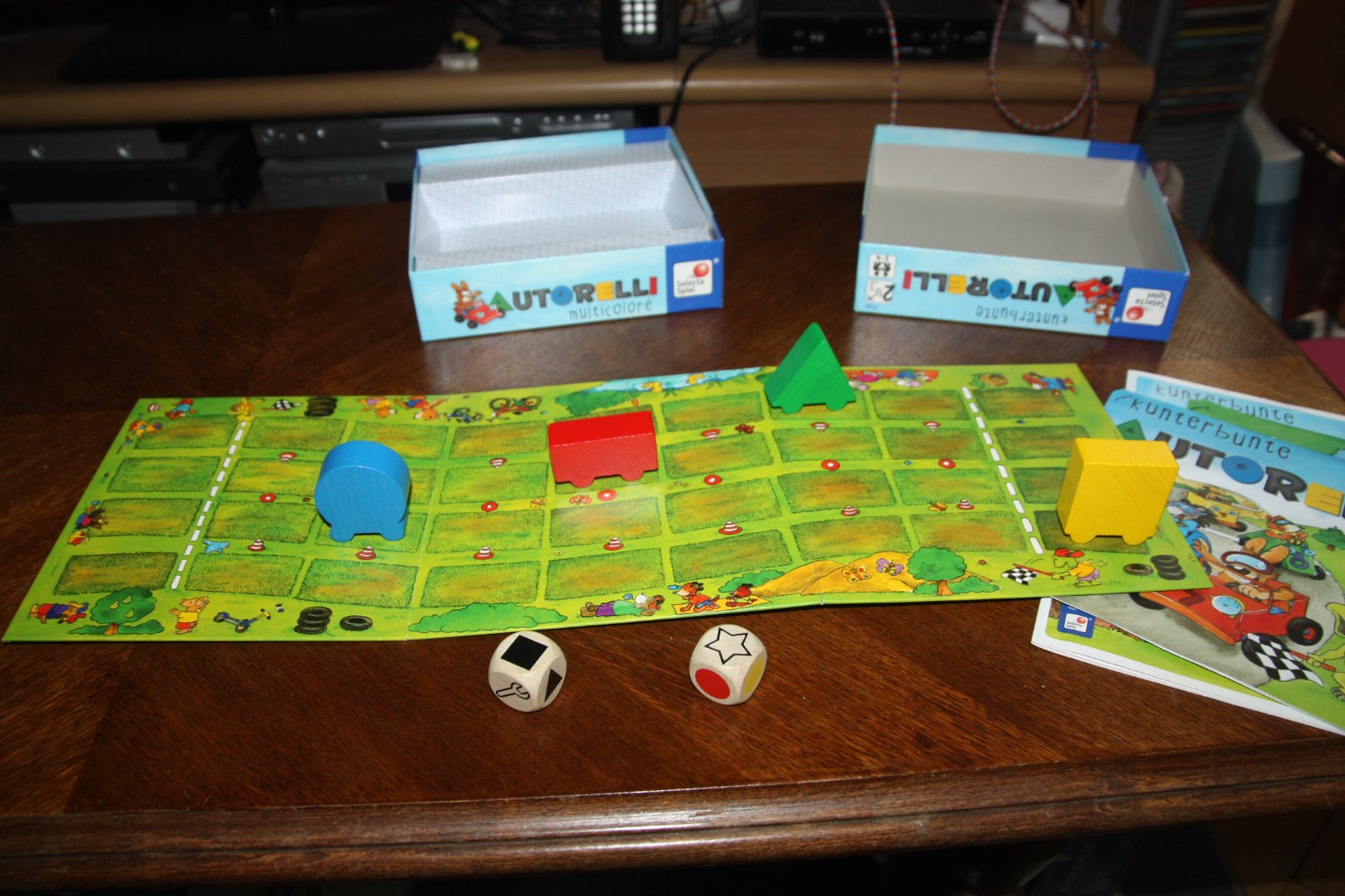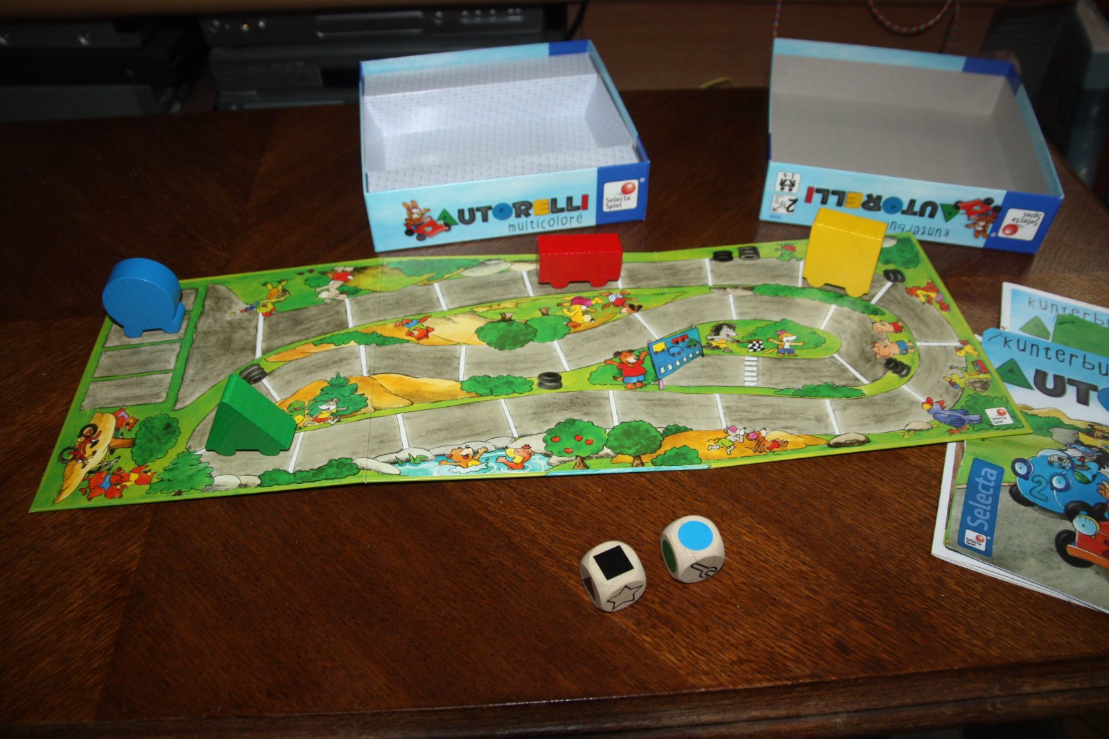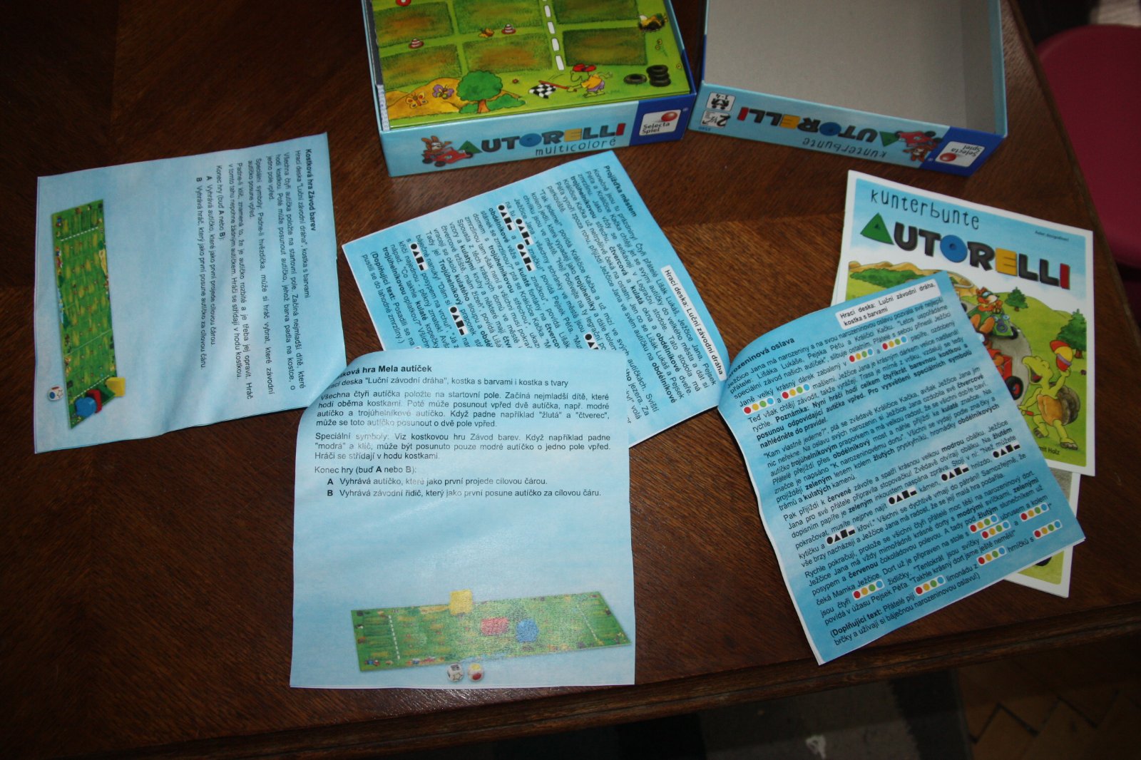 Hra Kunterbunte Autorelly. Pre 2-4 pretekárov od 2,5 roka. Originál pravidlá v nemčine, angličtine a francúzštine a priložený farebne vytlačený preklad do češtiny.