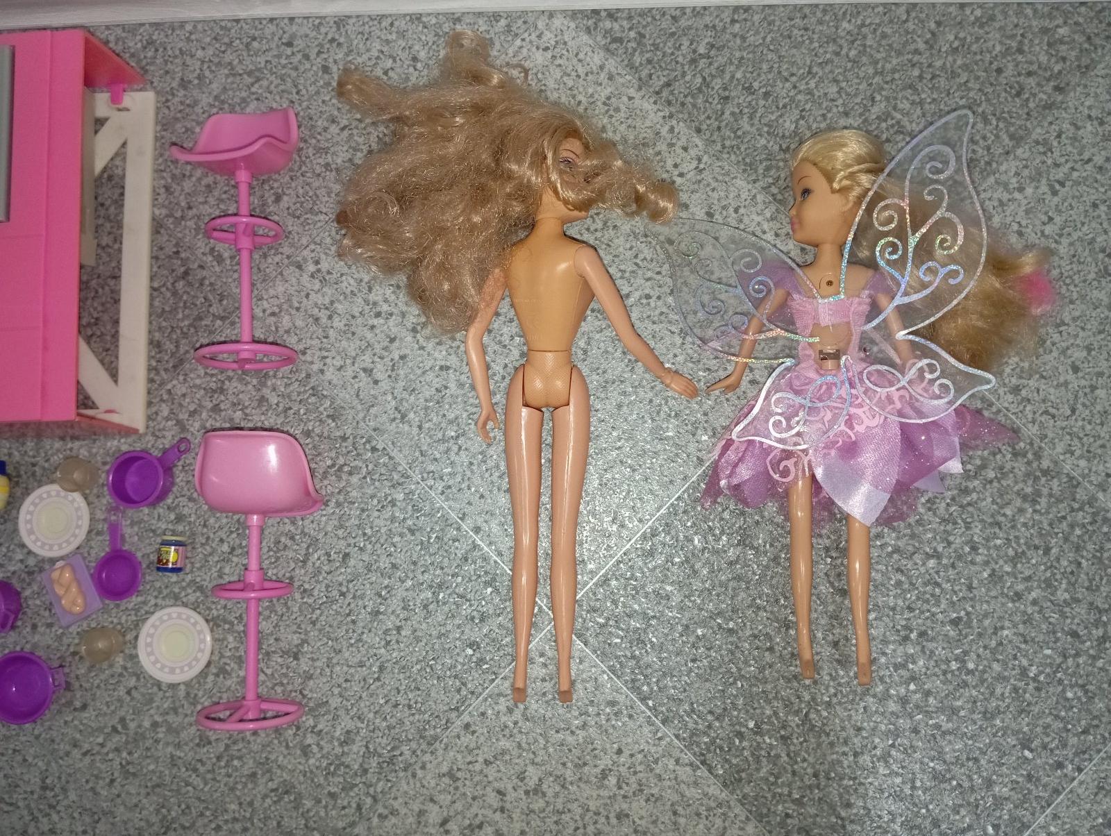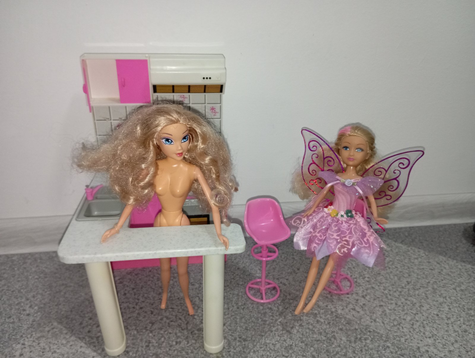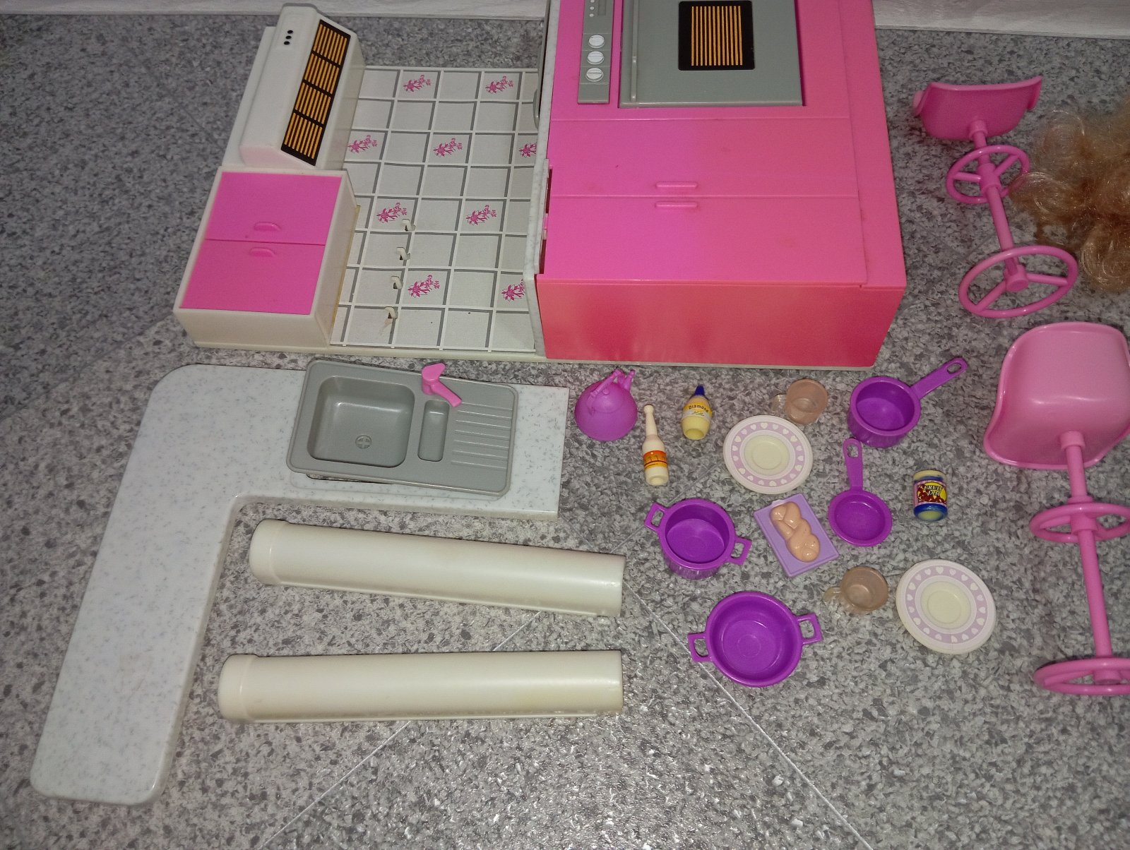 V cene je všetko (kuchynka, pult, stolík, riadiky a drobnosti, 2 barové stoličky a 2 bábiky).