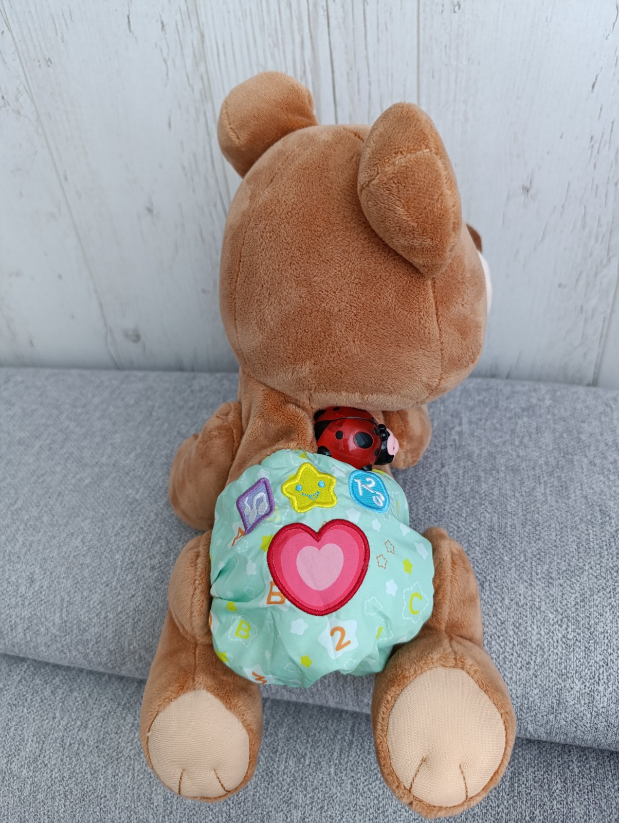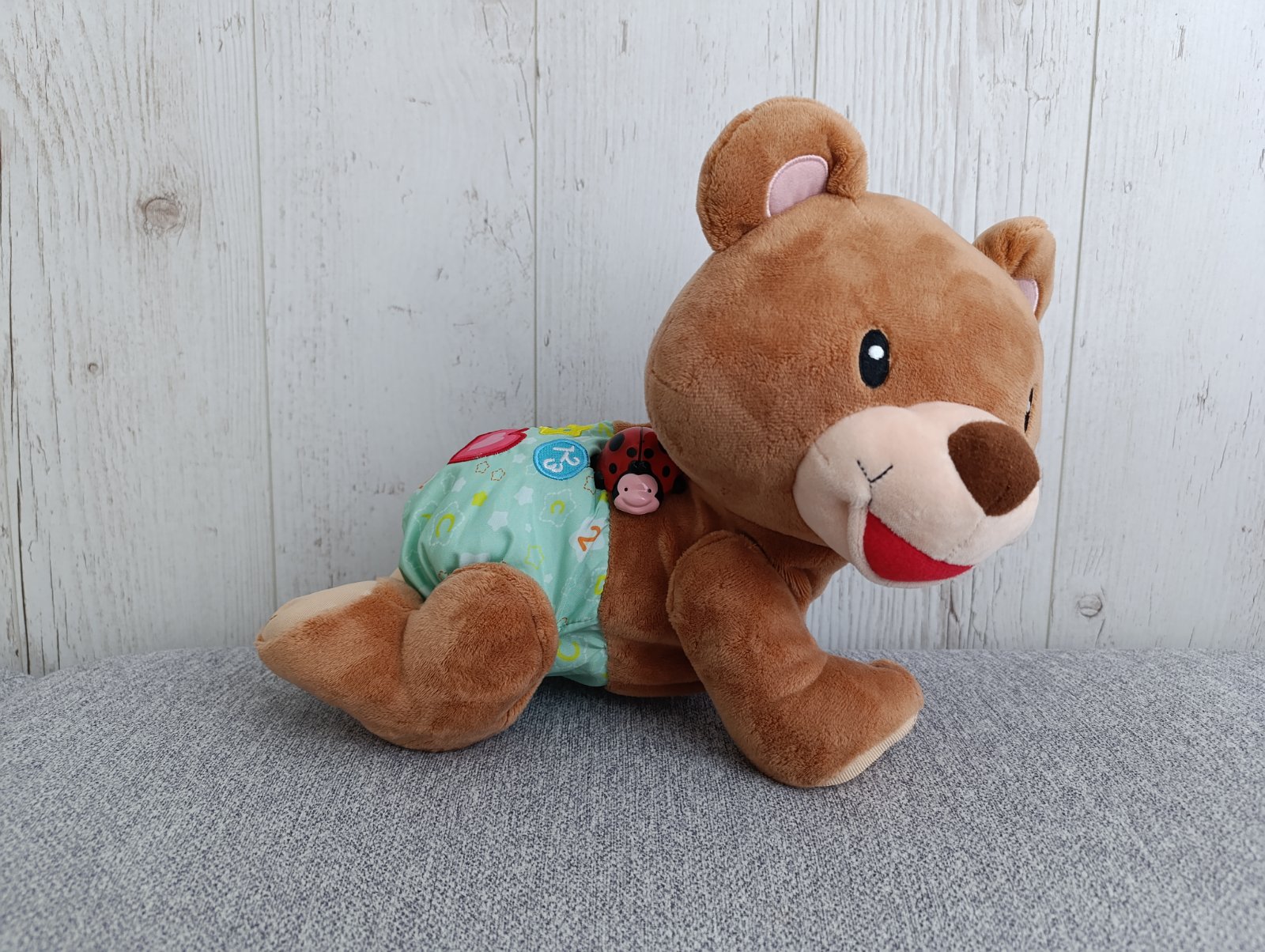 Značka Fisher price. Hrá upokojujúce melódie, bruško sa pohybuje hore dole, lampa svieti, hračka dýcha, bije mu srdiečko. Toto všetko sa dá zvlášť vypínať podľa potreby. Super pomôcka na zaspávani...