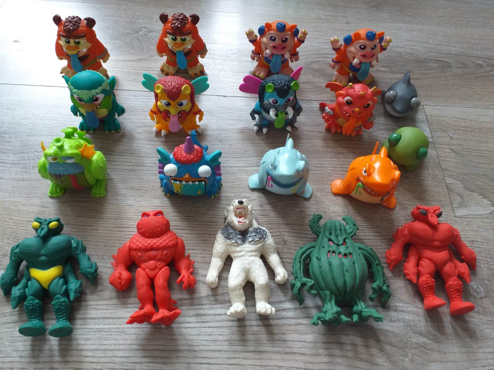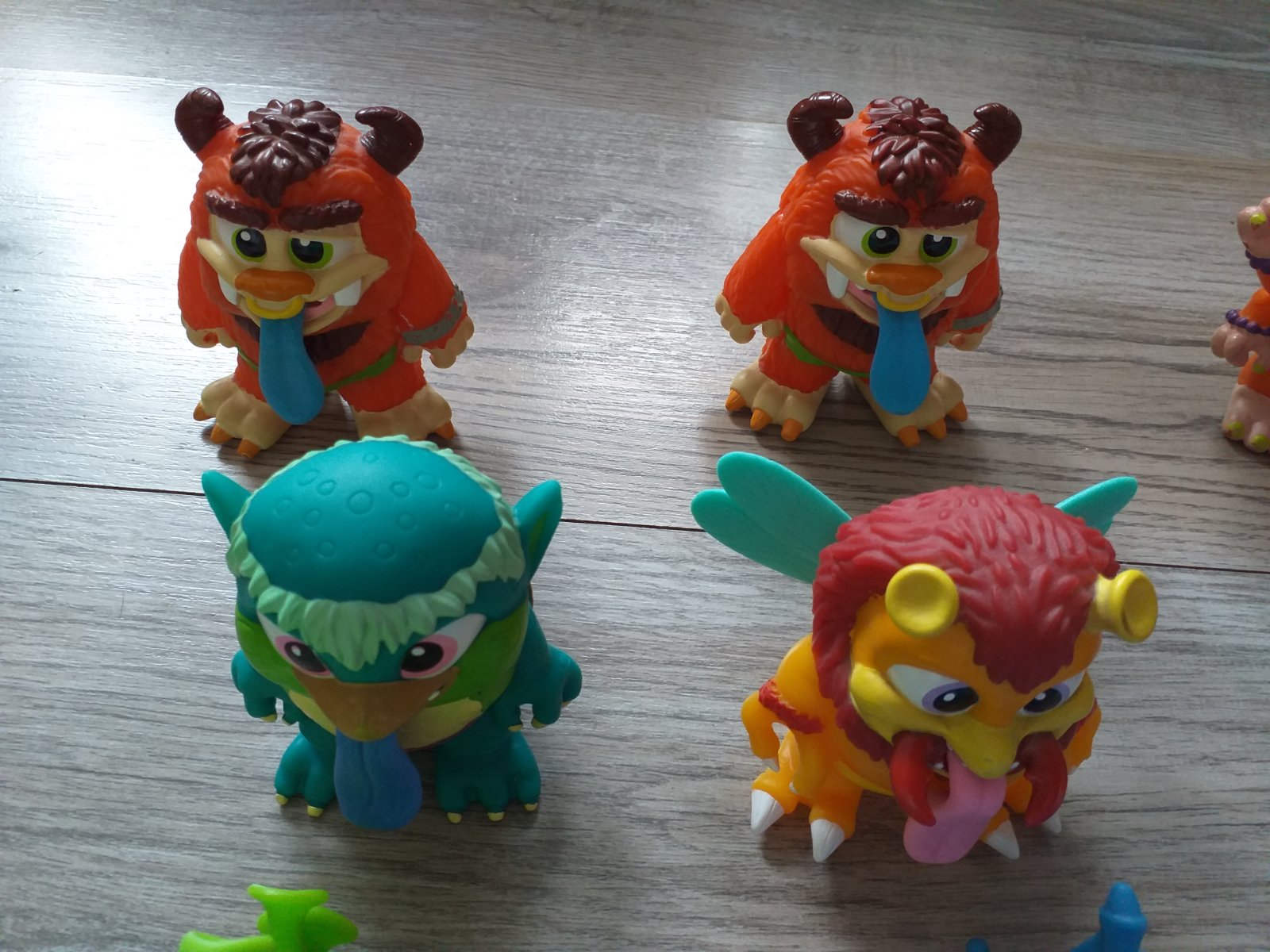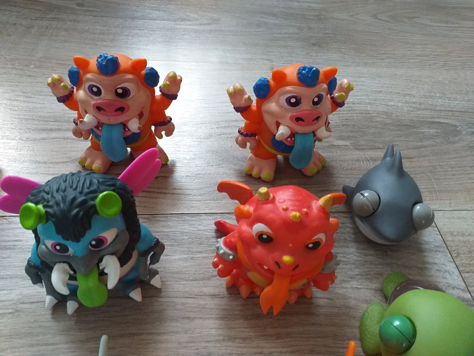 Niektoré úplne nové, iba vybrané z krabičky, niektoré hrané minimálne, bez poškodenia. Tretí rad zhora príšerky Barf Buddies- Keď potiahneš príšerku za chvost, otvorí sa jej veľká tlama, z ktorej bude vytekať farebný sliz. Bez malých figúrok a slizu. Horný a druhý rad zhora príšerky Flingers- vydávajú zvuky, Spodný rad plastové naťahovacie príšerky. Cena 2 eur za jednu.