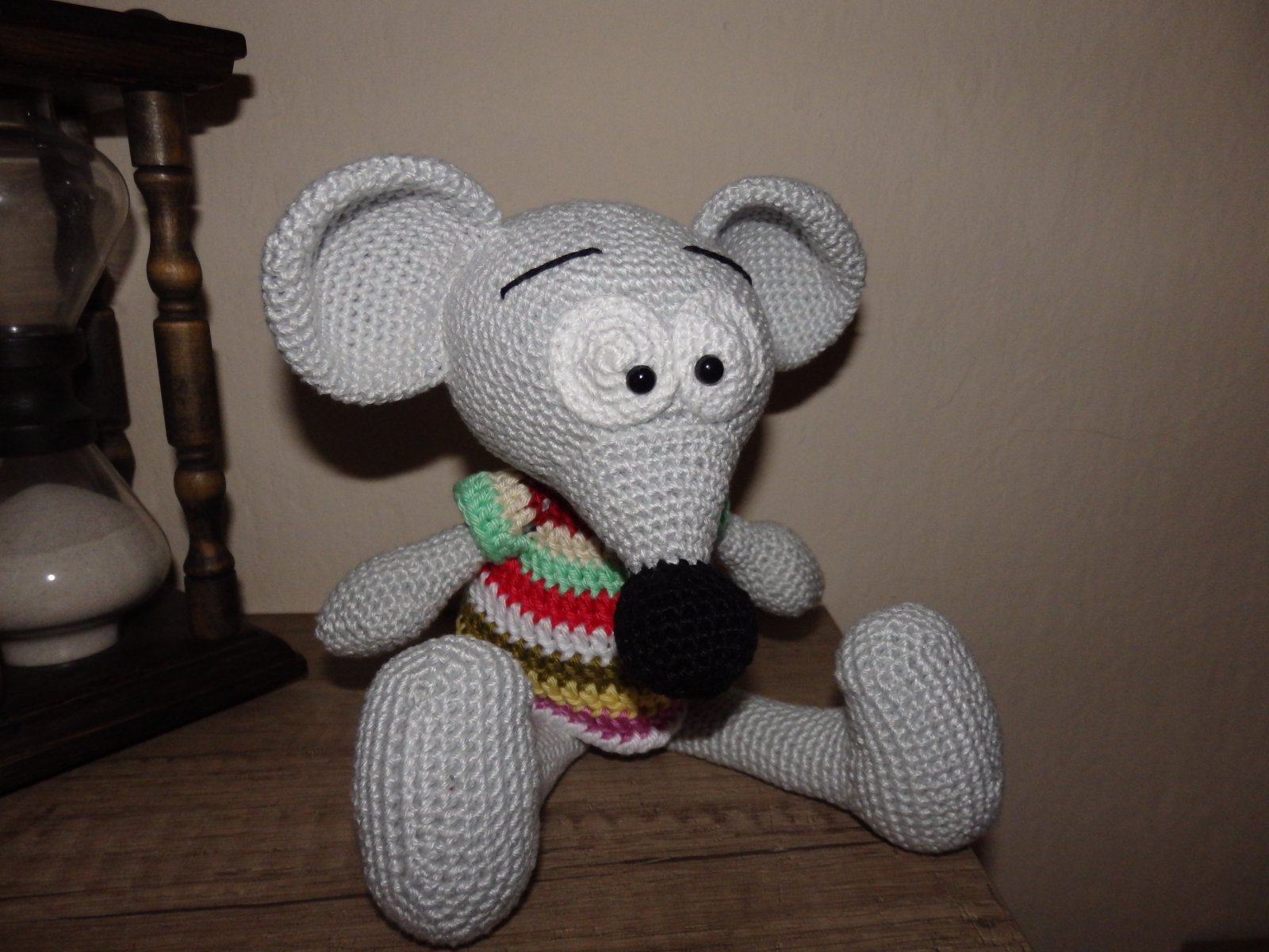 hackovana myska ma v sede 14 cm, v stoji 23 cm, pouzita je 100% bavlna, ocka su bezpecnostne a vypln je dute vlakno
