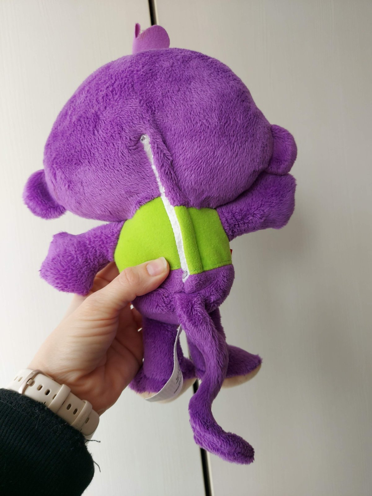 Rozprava/spieva pri stlačení bruška ci pri prevrátení hore nohami. Strojček na 2x batériu AAA sa da vybrať a hráčka oprať.