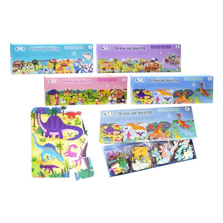 Postav si prvé puzzle. Je ti málo? Postav si druhé, tretia a aj štvrté. Nakoniec ich spoj a vznikne ti pekný obrázok. Drevené farebné variabilné puzzle. Balenie obsahuje štyri samostatné obrázky (12ks, 18ks, 26ks a 38ks), ktoré môžeš spojiť do jedného. Z obrázka môžeš vybrať štyri základné tvary (4ks dopravných prostriedkov alebo 4ks dinosaurov alebo 4ks rozprávkových postáv alebo 4ks zvieratiek) Drevené puzzle 4 v 1. Možnosť výberu zo štyroch druhov - dinosauri, rozprávky, zvieratká alebo dopravné prostriedky. Nevhodné pre deti do 3 rokov.