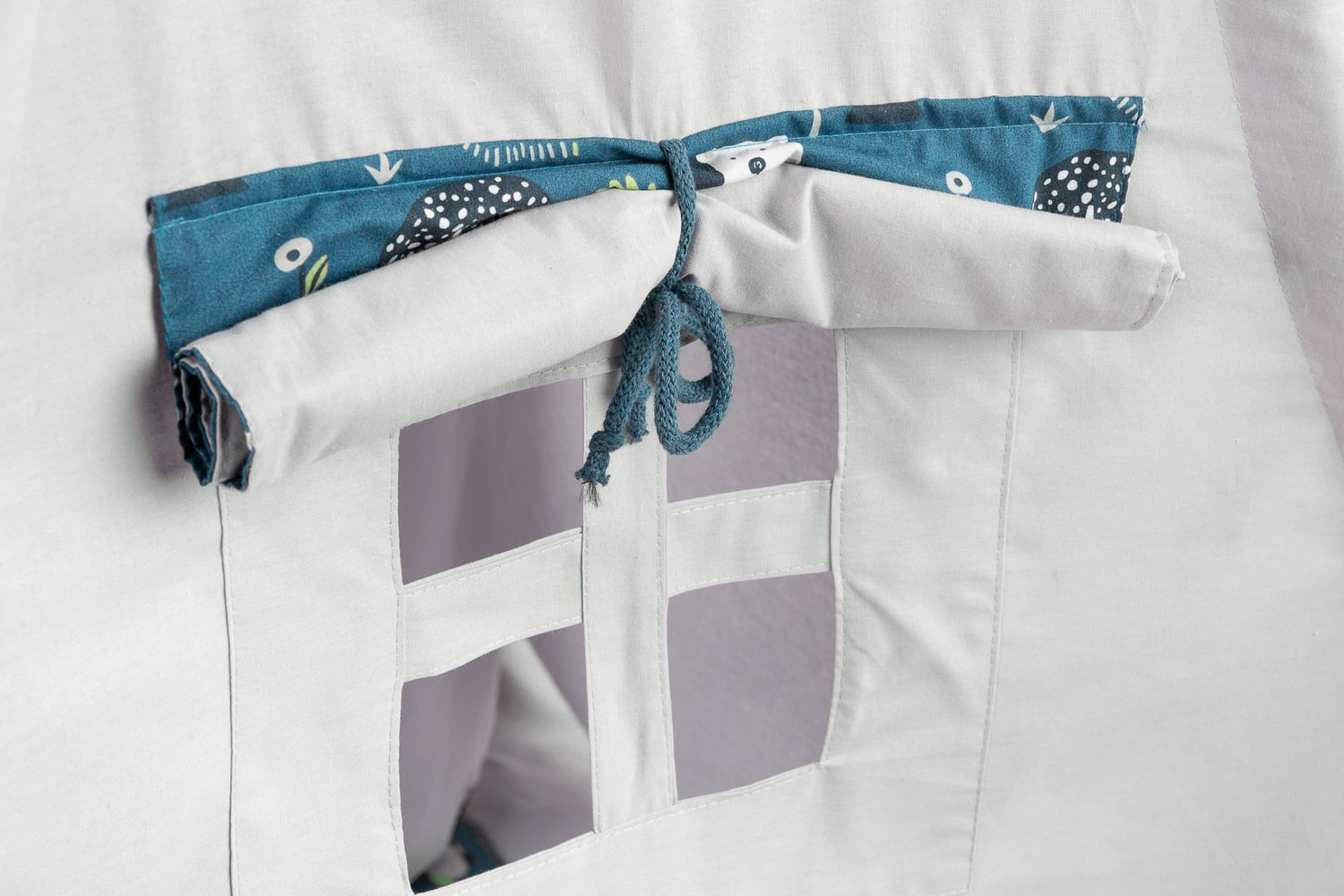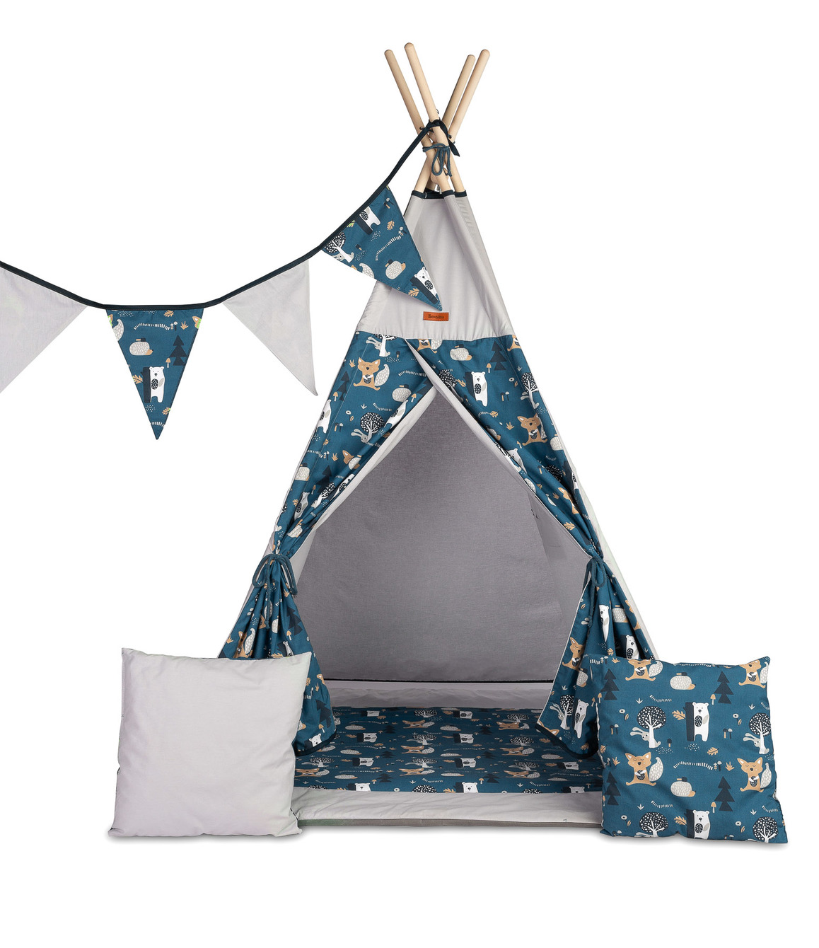 Sada obsahuje skladací stan pre deti, tyče, 2 vankúše a girlandu. Výrobok je vyrobený v Poľsku.