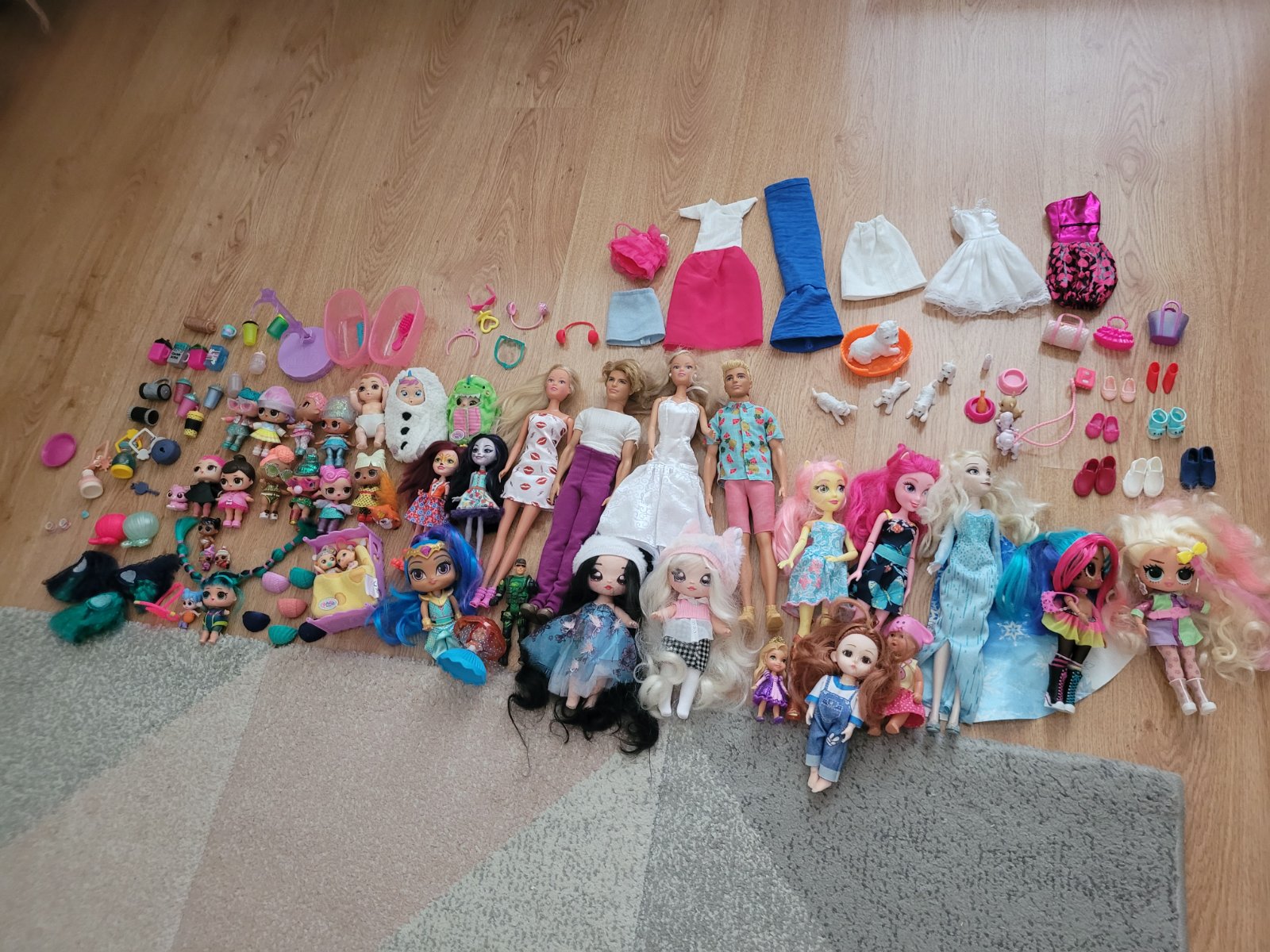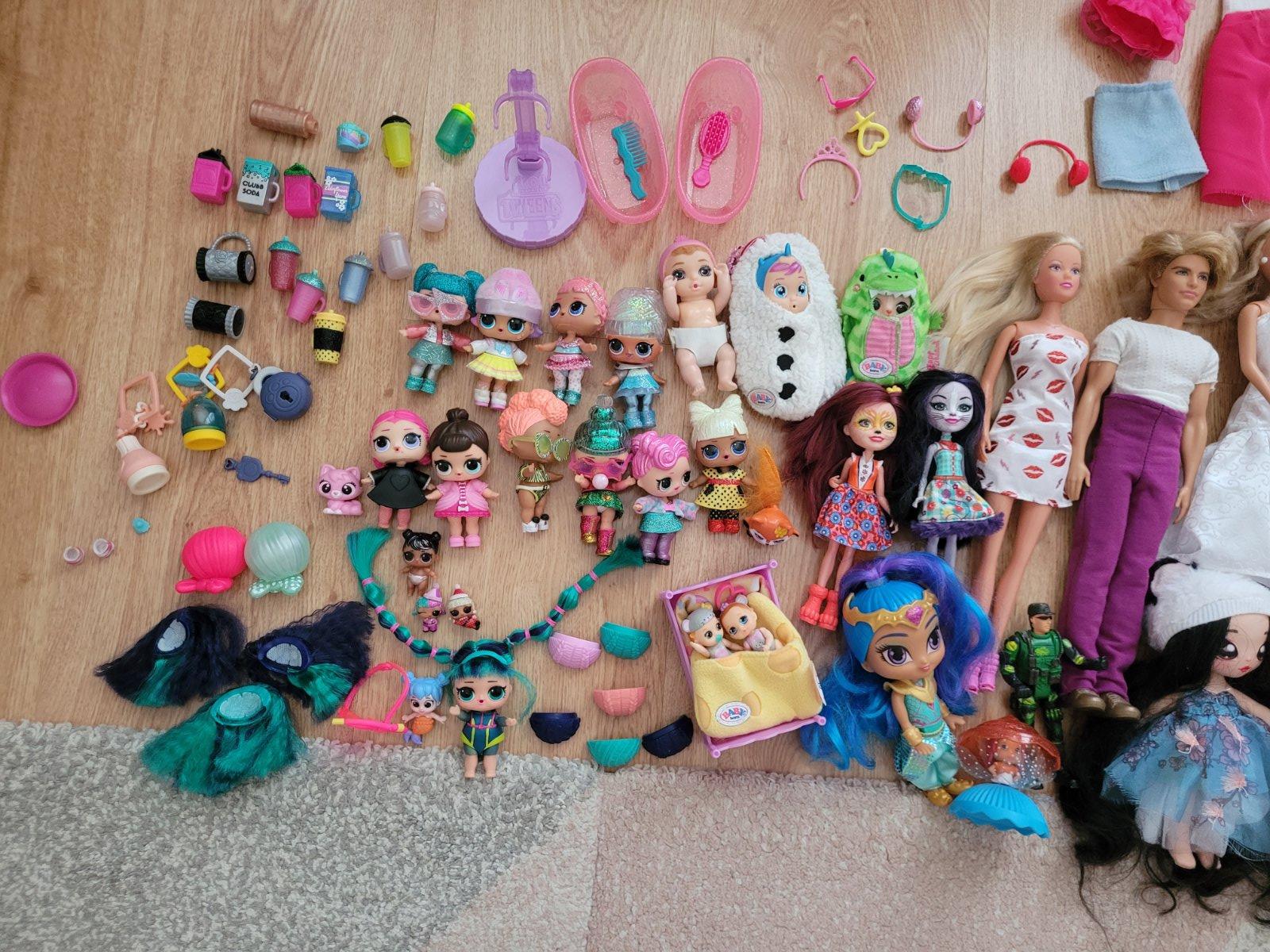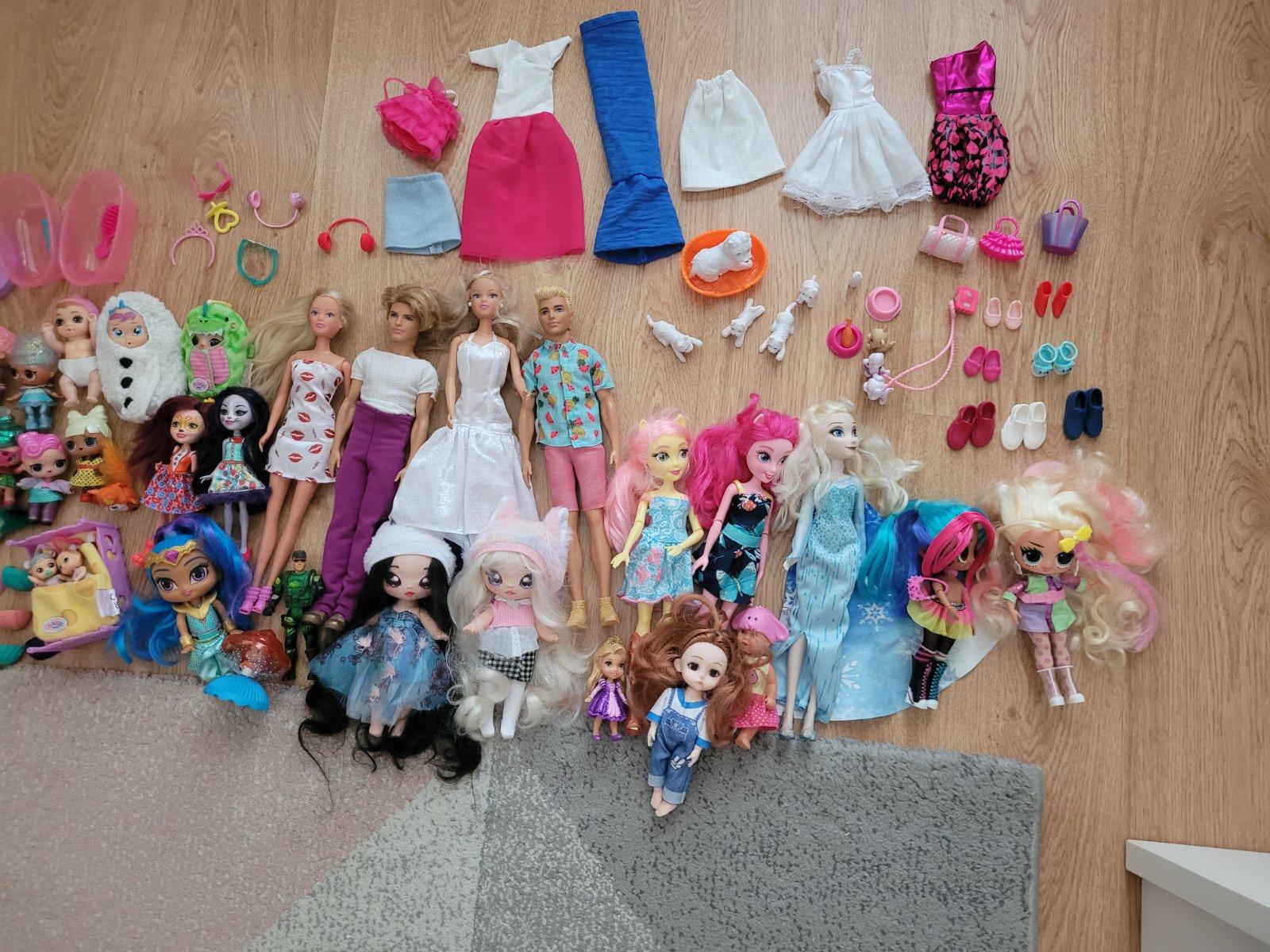 Bábiky rôzneho druhu s príslušenstvom.