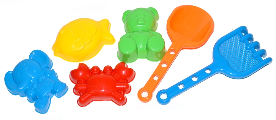 Sada obsahuje : 4 ks formičiek rôznych tvarov, 1 x lopatka, 1 x hrable