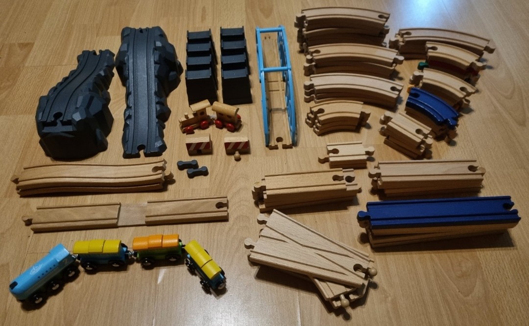 Predám drevené koľajnice(veľká sada) 75ks. Plus vláčiky. Cena 70e