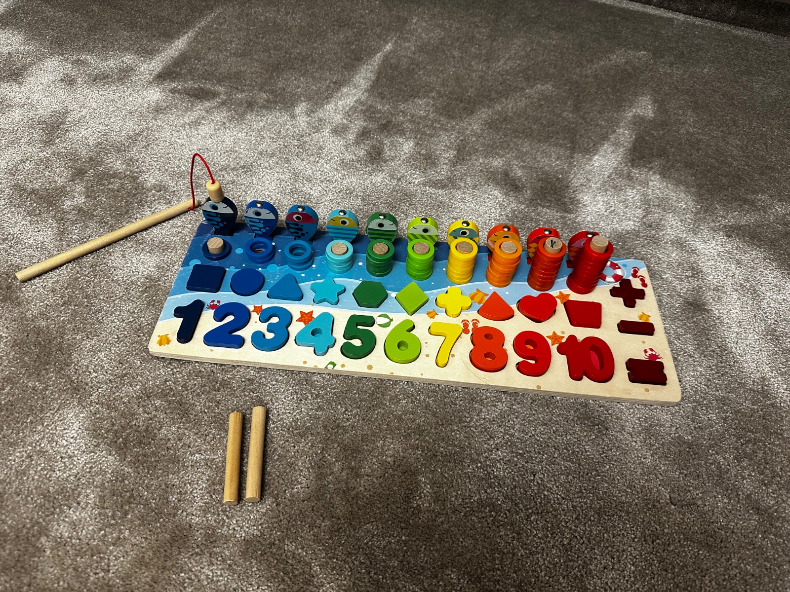 bežné opotrebenie. Dva kolíky / originál / chýbajú, ale dodám náhradné, trošku tenšie, len ich treba zrezať na príslišnú výšku. Hračka sa dá používať aj bez týchto kolíkov.