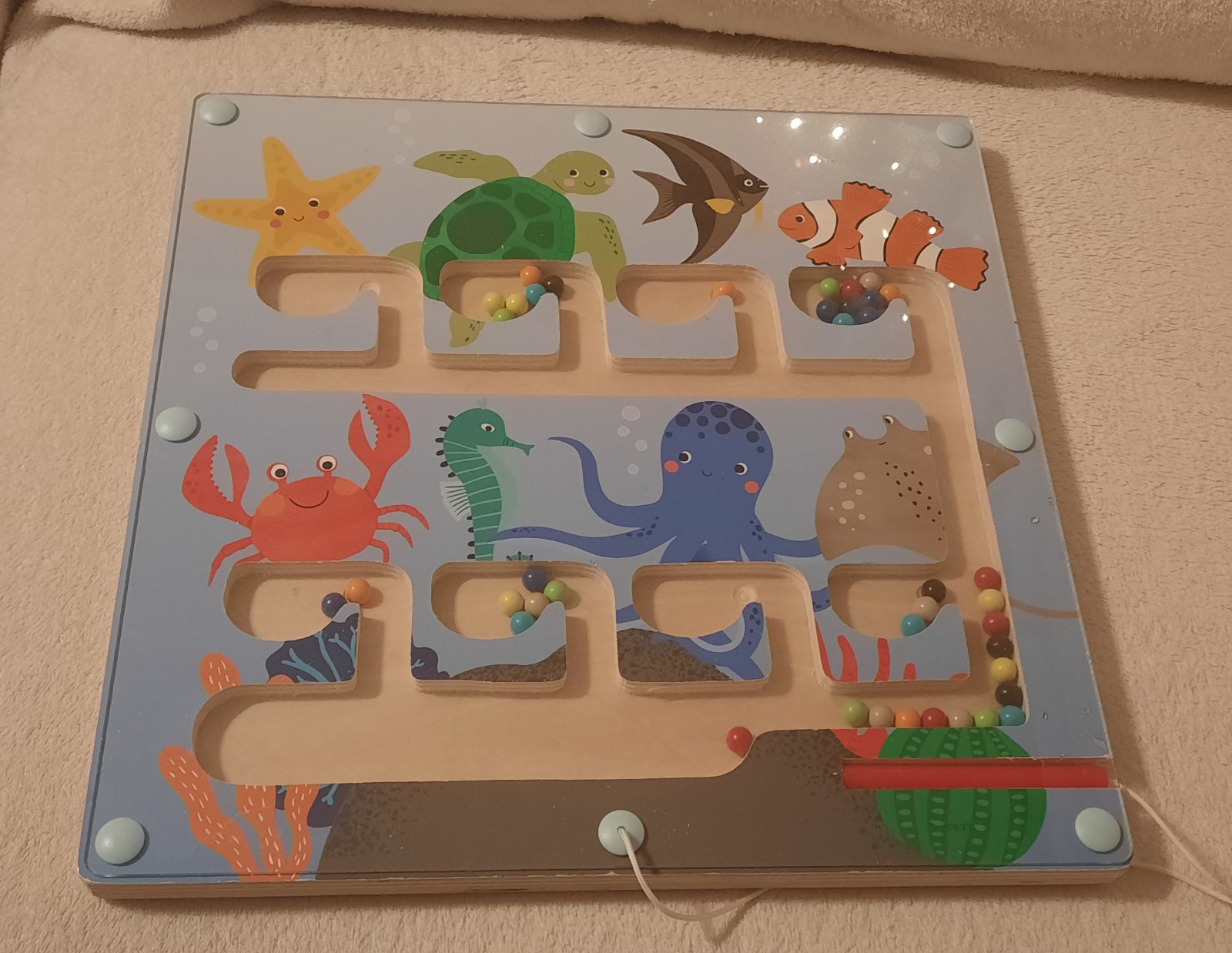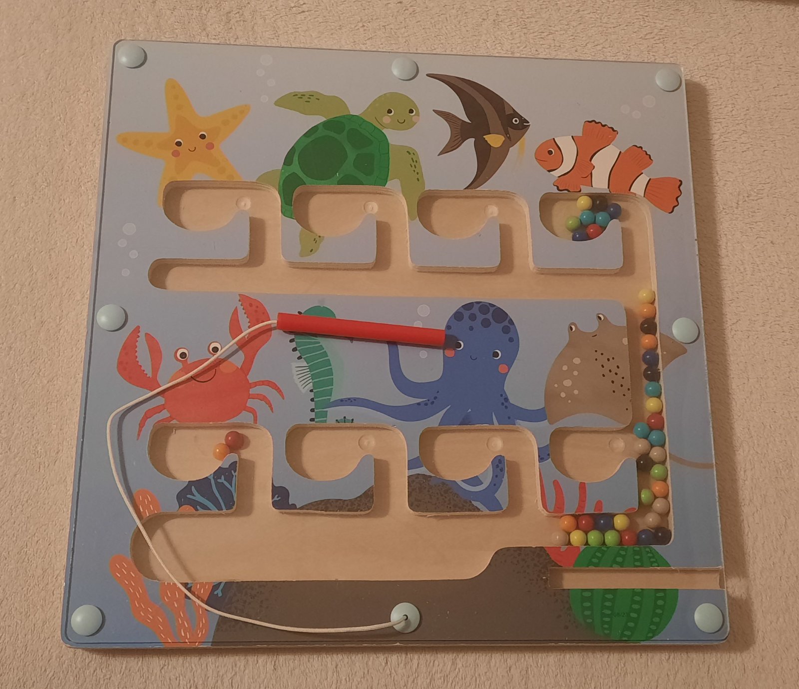 Labyrint s farebným guličkami a magnetickým perom - guličky treba perom roztriediť a premiestniť do komôrok - podľa farieb zvieratiek.