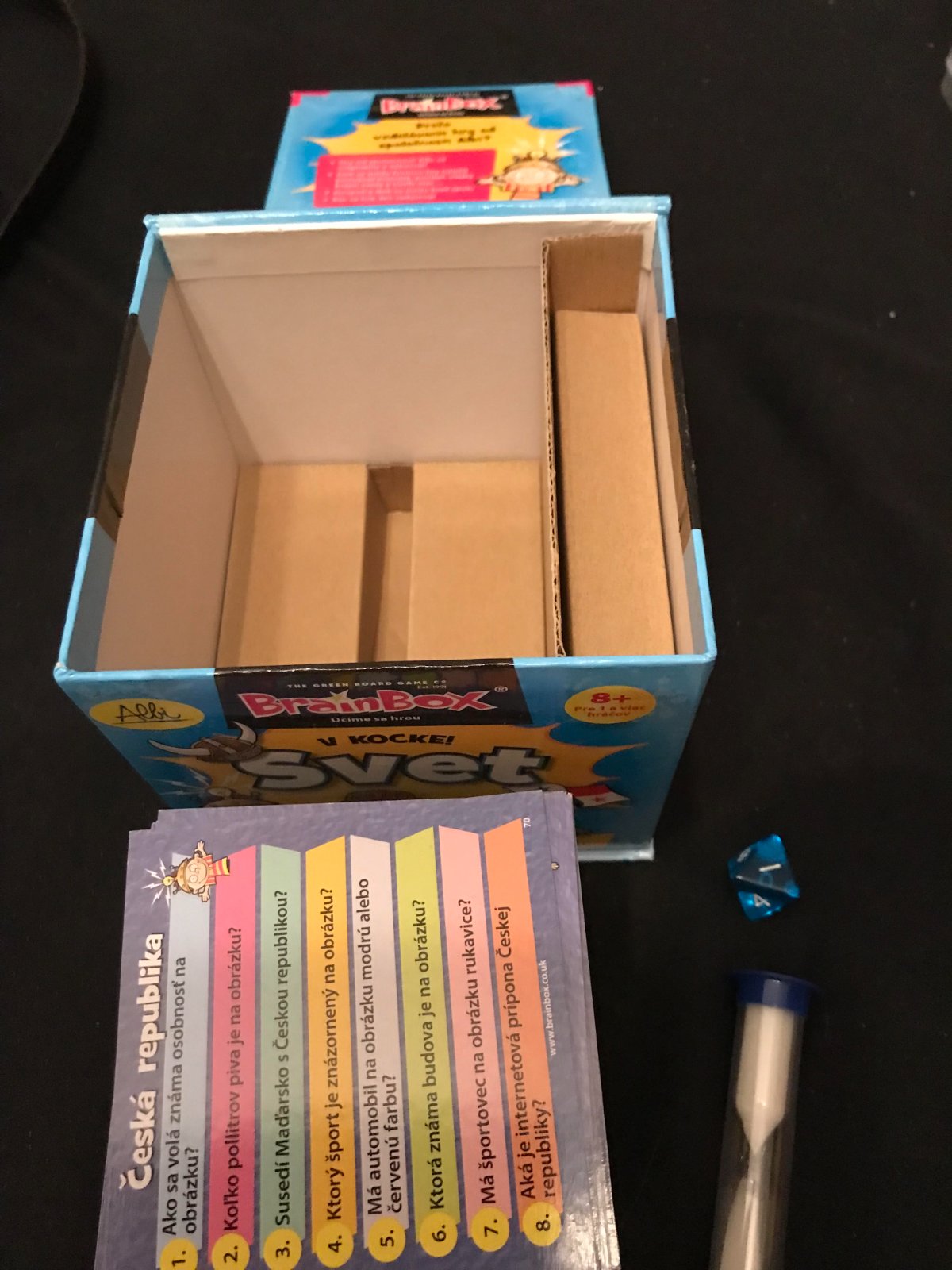 Predám zábavnú pamäťovú stolovú hru zo série Brainbox na tému Svet v kocke. Brainbox je kartová hra na pamäť a pozornosť. BrainBox Svet obsahuje 55 hracích kariet, ktoré predstavujú rozmanitú škálu krajín od Veľkej Británie po USA, od Grécka po Ghanu.