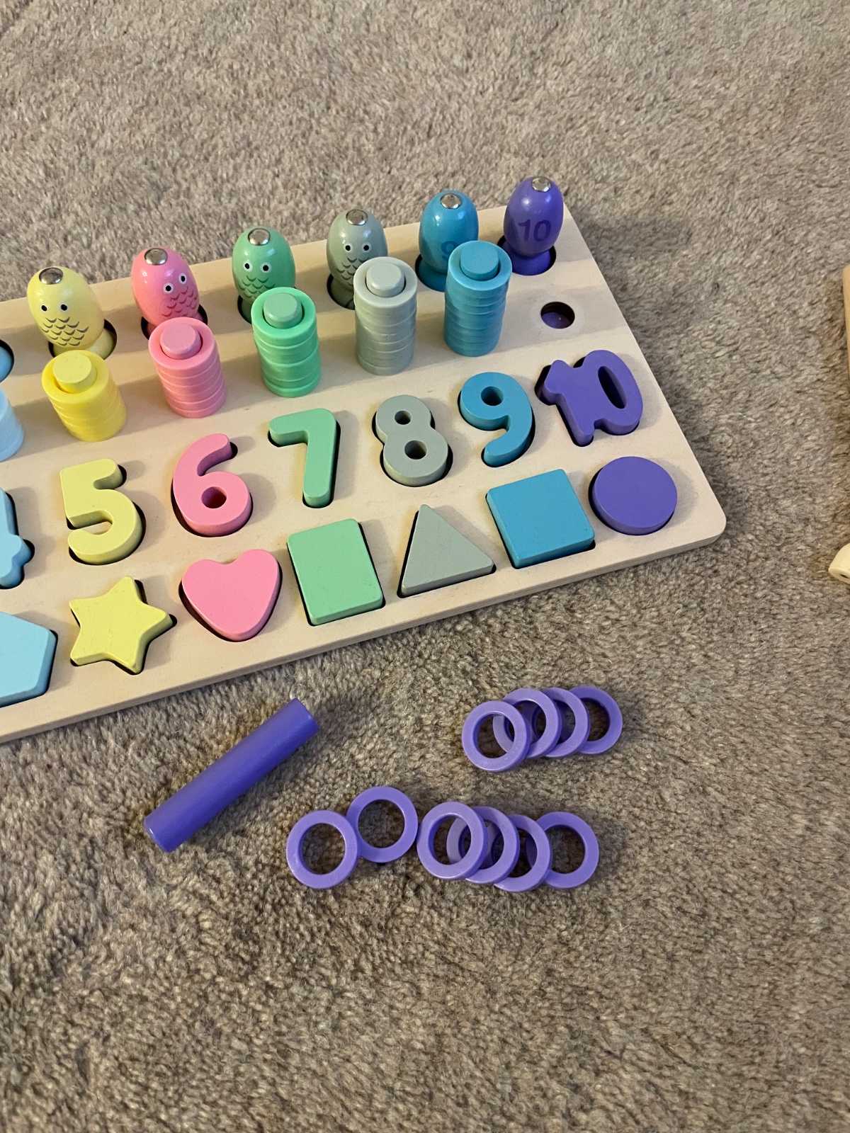Úžasná drevená hra, pomocou ktorej sa dieťatko dokáže naučiť farby, tvary, čísla, počty (krúžkami-hmat aj vizuál) a taktiež môže loviť rybičky ☺️ pod každým tvarom a číslom na neho čaká zvieratko alebo potravina
