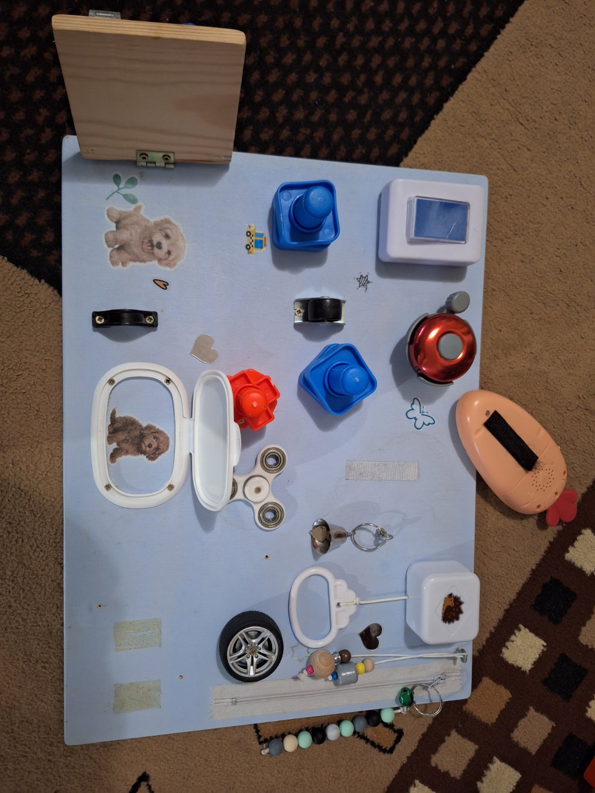 Svetielko svieti, mobil hraje, ta biela krabička po zatiahnuti šnúrky hraje pesničku/uspavanku. V rohu bola zástrčka len sa zlomili tie količky, bolo to plastove. A v strede bol nalepeny veľký obrazok len sa odlepoval takže sme odlepili a dokupili veci, doložili na tabuľku a trochu popresuvali. Takže do rohu si môžete ešte niečo doložiť.
