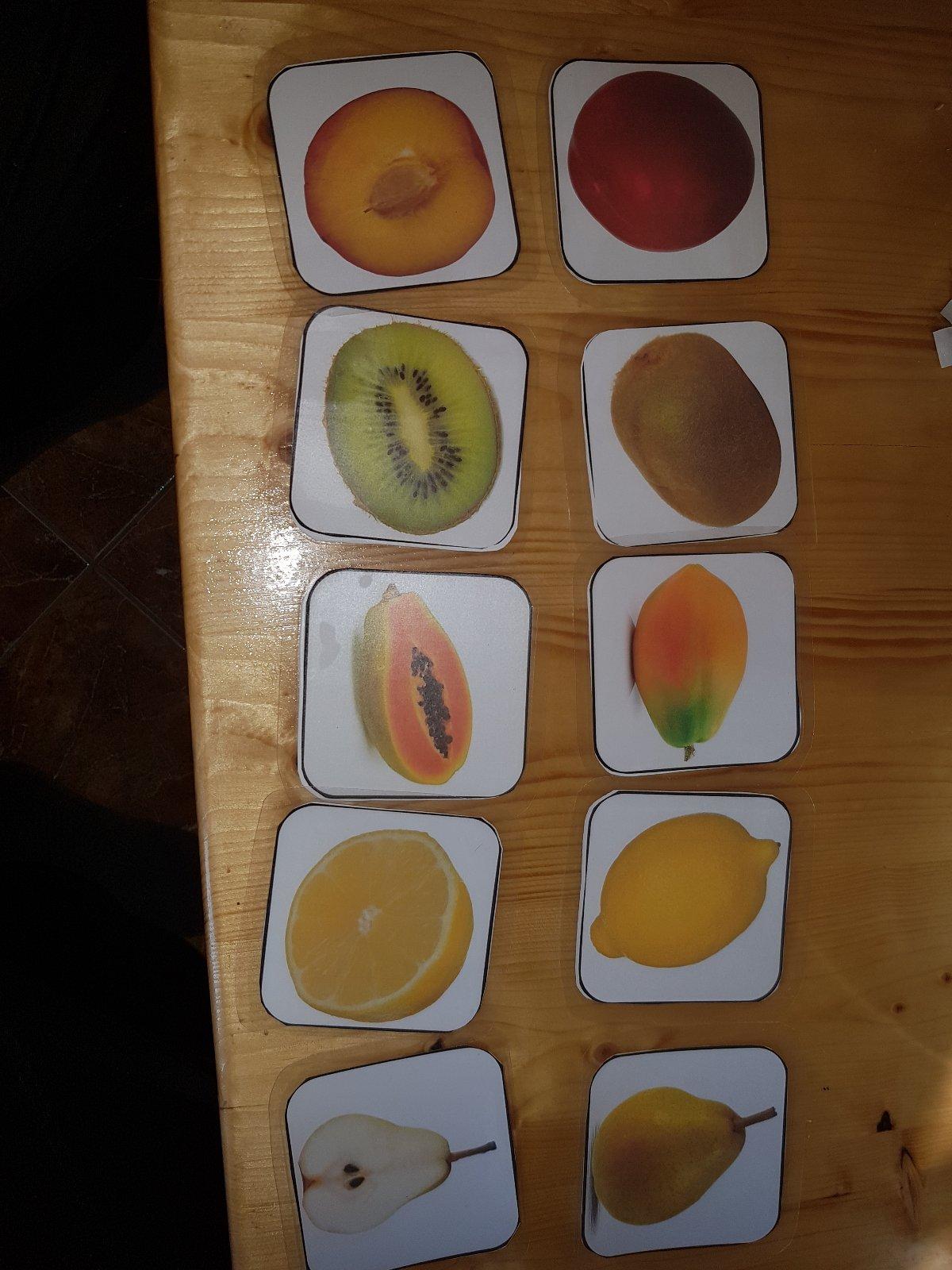 Domáca výroba. Zalaminované pexeso kartičky. Dieťa sa učí spájať celé a prepolené ovocie.