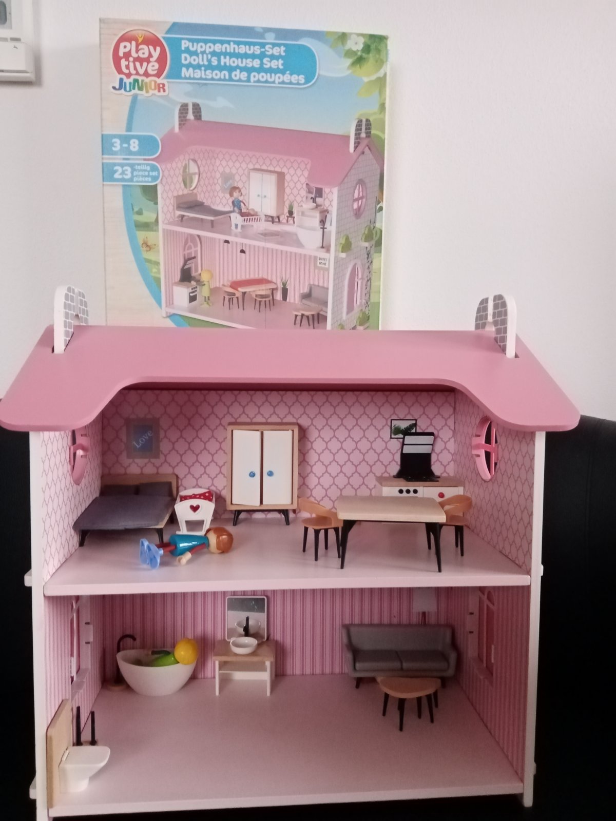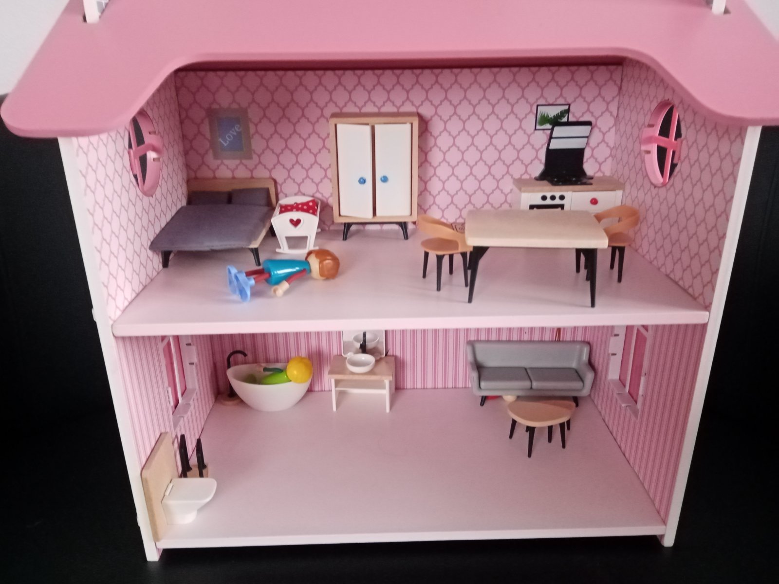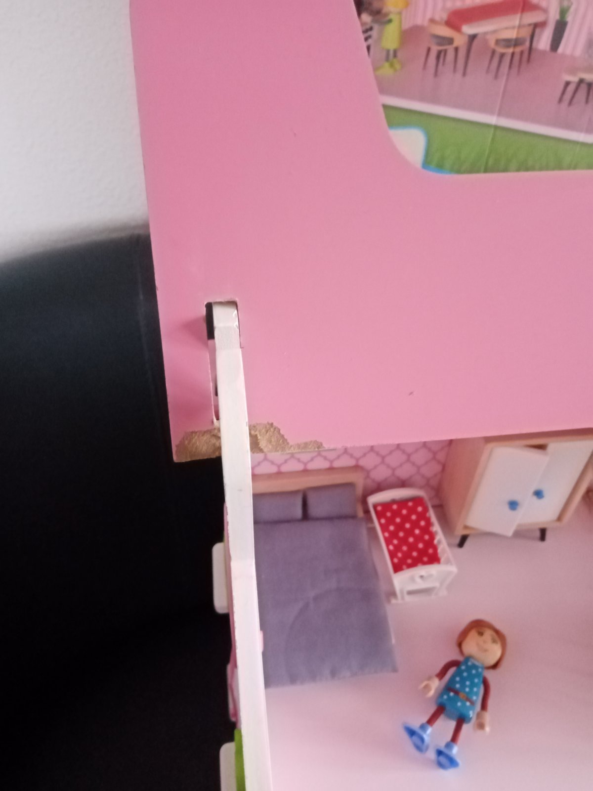Drevený domček (Lidl) aj s príslušenstvom, veľmi dobrý stav. Ľahko sa zloží aj rozloží. Jediná chybička krásy odfotená na poslednej foto, ale je to zvnútra, nevidno to. Mám aj krabicu. Rozmer domčeka približne 50*50*25cm.