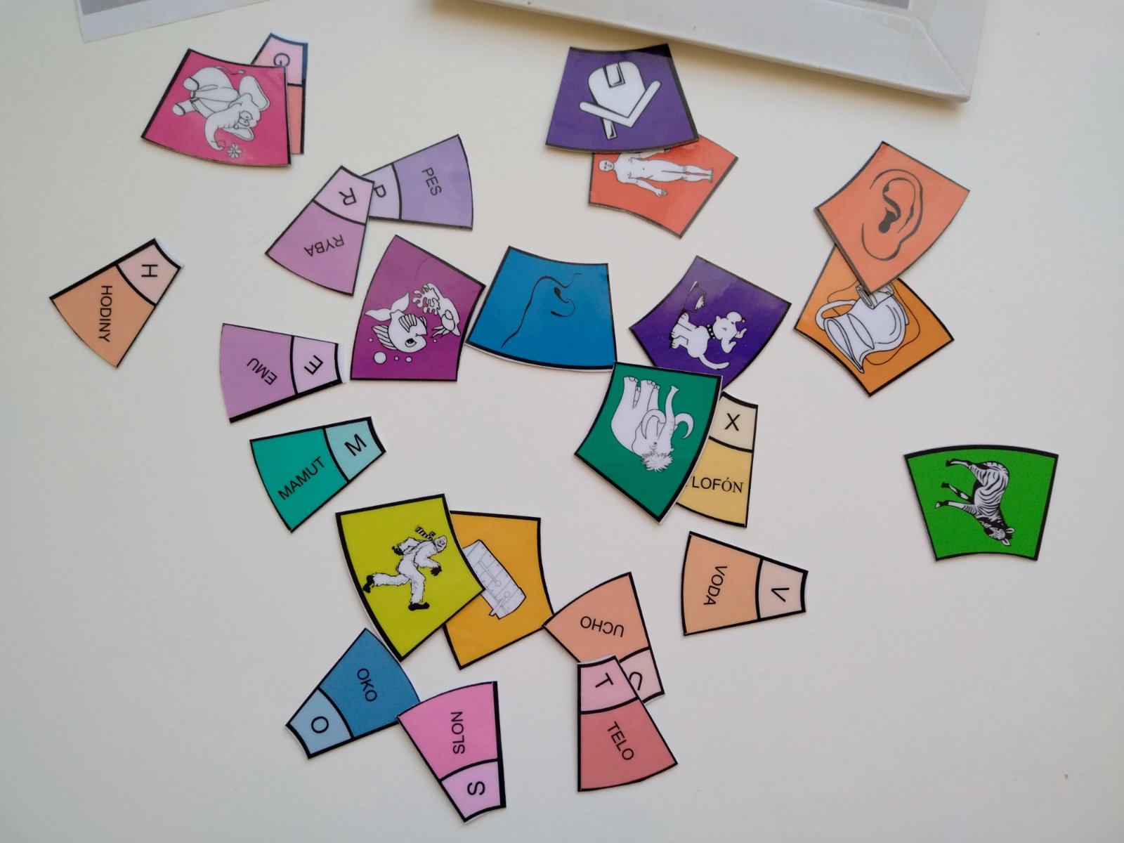 Obojstranné kartičky: Majú tvar výseku kruhu. Na jednej strane je ilustrácia (napr. slon, mamut, ucho) a na druhej strane je zodpovedajúci názov s počiatočným písmenom.