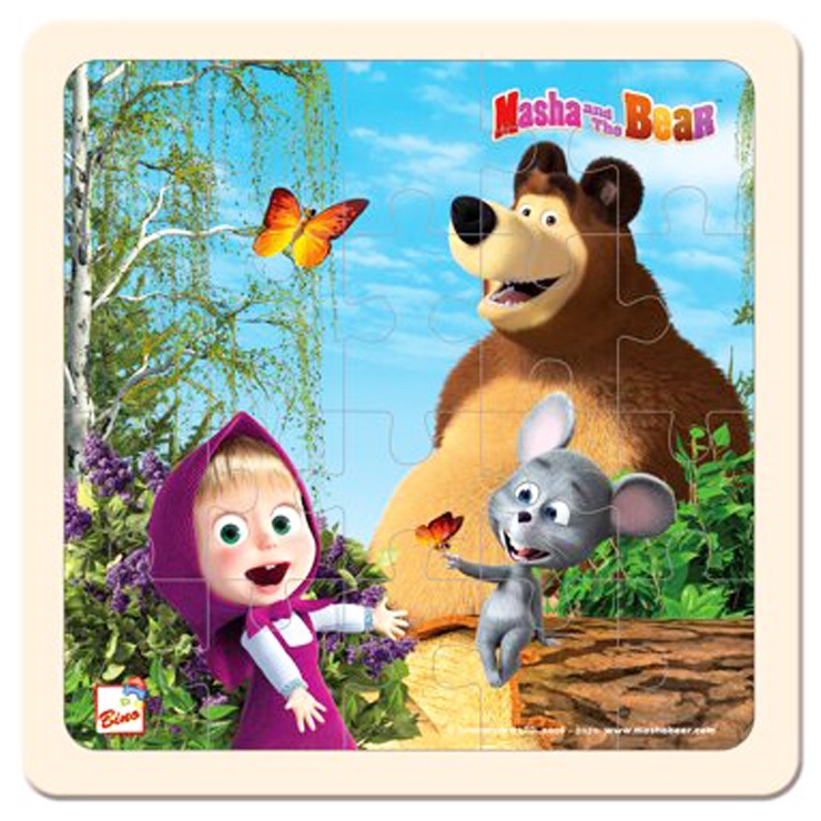 Drevený puzzle obrázok s rozprávkovými postavičkami, ktoré poznajú dievčatá a chlapci z animovaného seriálu Máša a medveď.