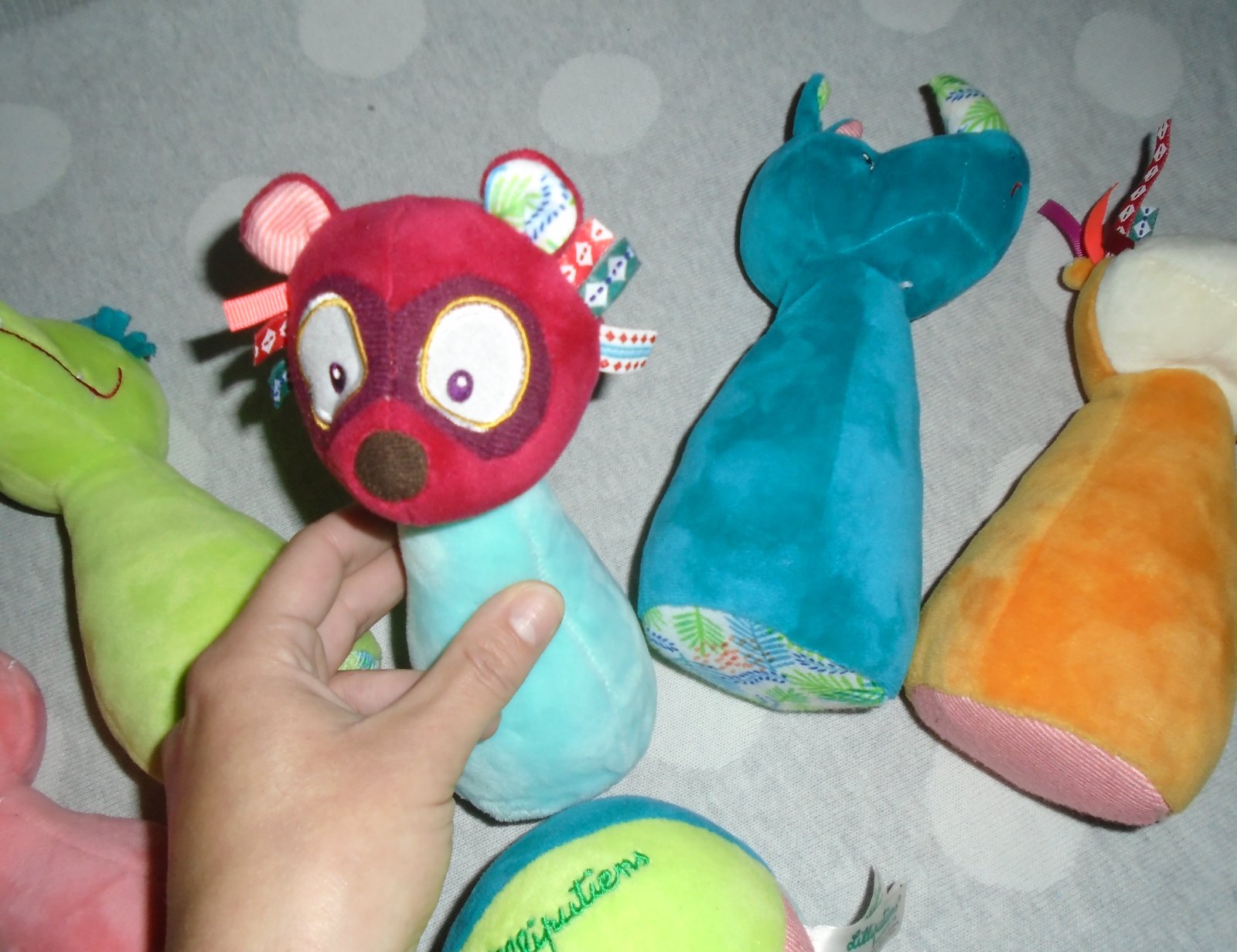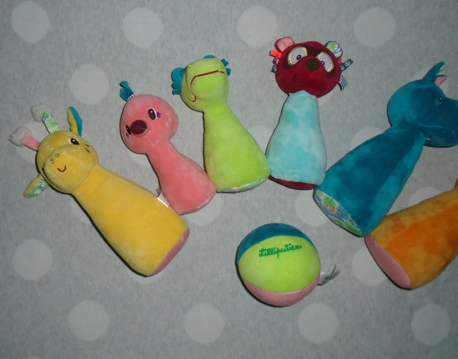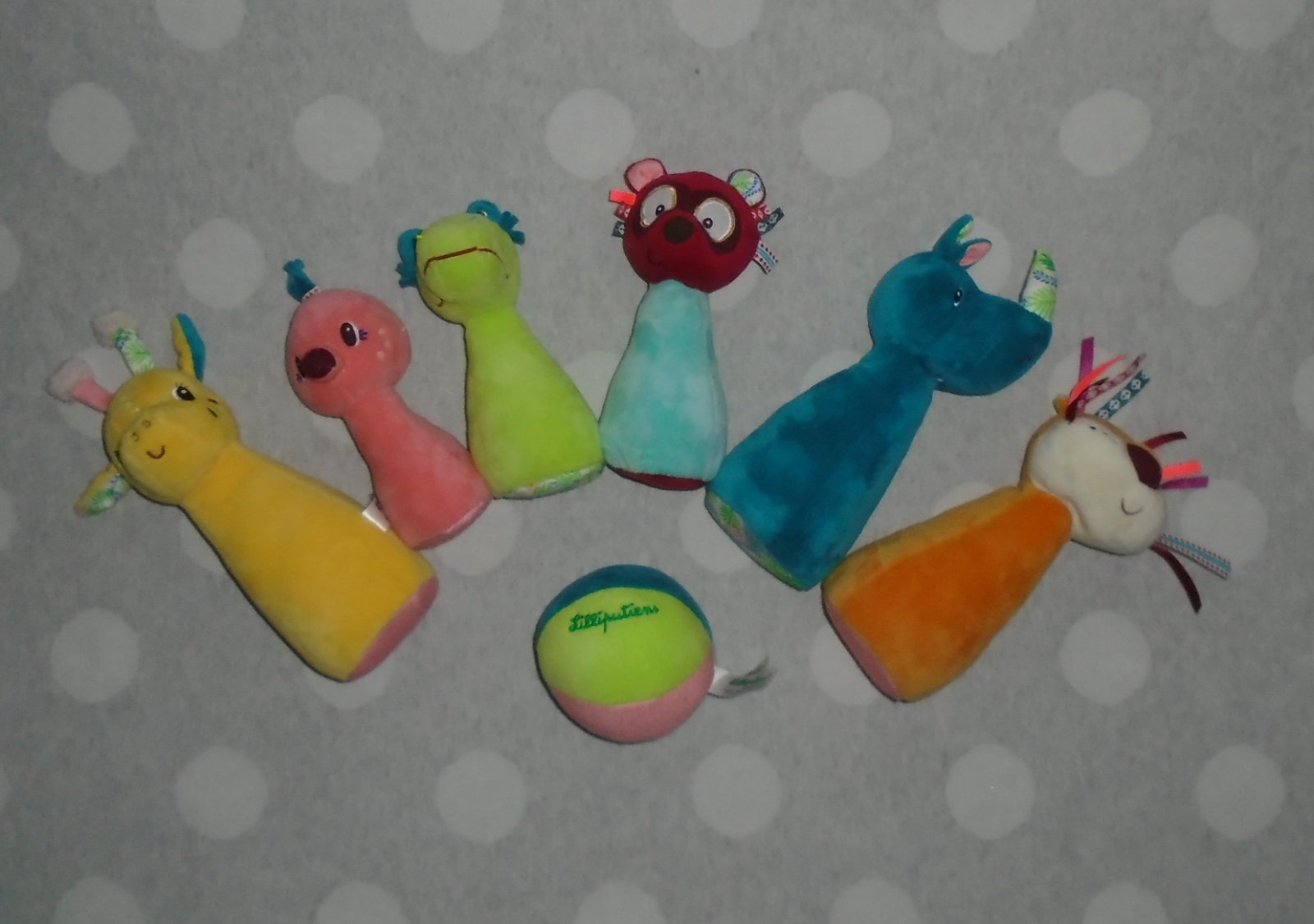 Zvieratká sú plyšové, rovnako ako bowlingová guľa, ktorá má v sebe navyše ešte hrkálkový prvok.