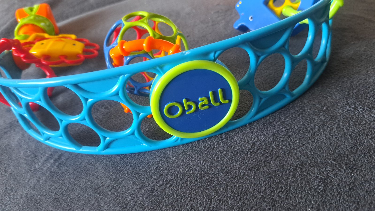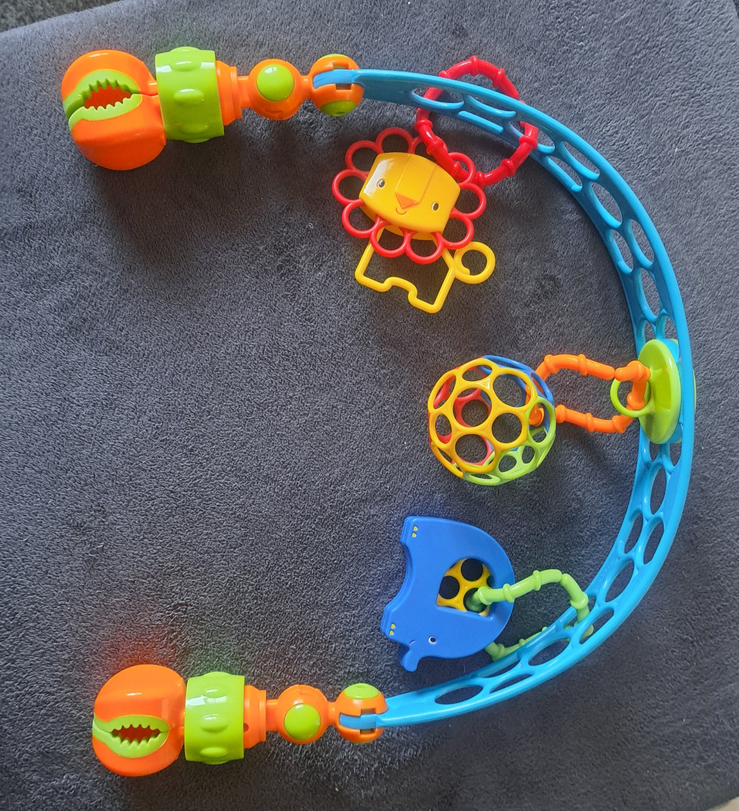 Krásna hrázda na hranie značky Oball s troma hračkami. Možné uchytiť na kresielko, kočík, postieľku, kolísku a podobne.