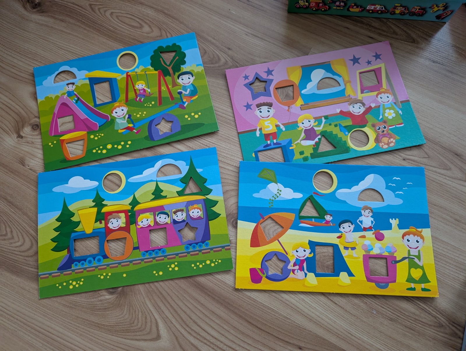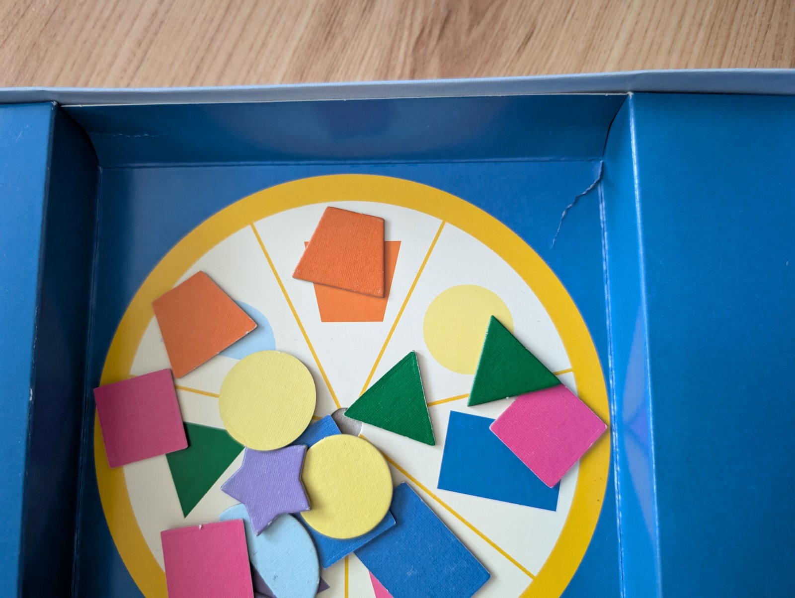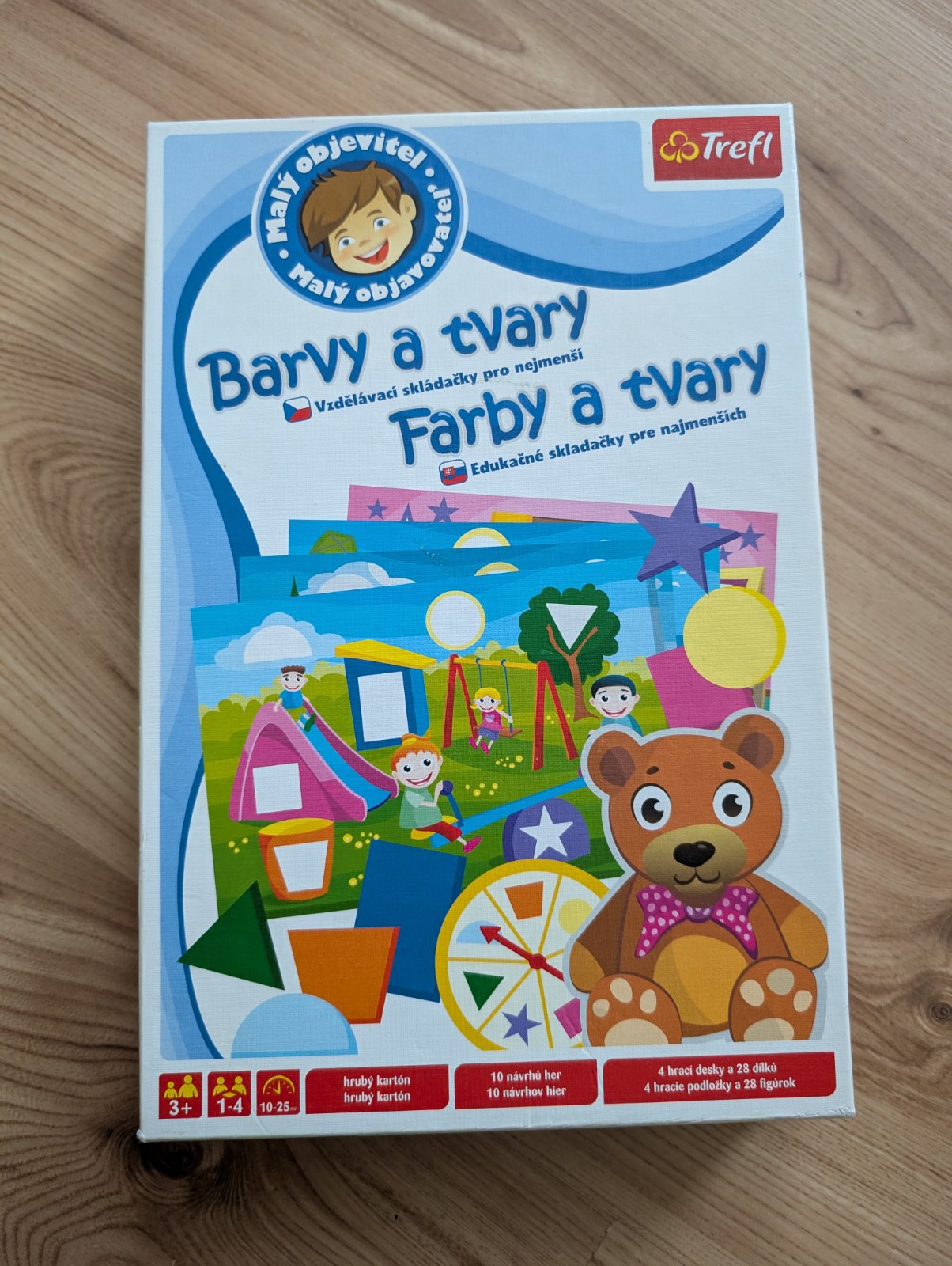 Pekný,hrany stav, bez poskodeni. ( Tá stredová ,červená šípka chyba,ale ničomu to nebráni) Edukačná hra, pri ktorej si deti precvičujú rozlišovanie farieb a tvarov. Dokonale rozvíja zrakovú analýzu, podporuje abstraktné myslenie a sústredenie. Súčasťou hry sú scenáre a príklady hier určené rodičom. Veľké diely sú z hrubého kartónu pokryté vysokokvalitnými farbami, ktoré zaručujú bezpečnú hru aj malým deťom.
