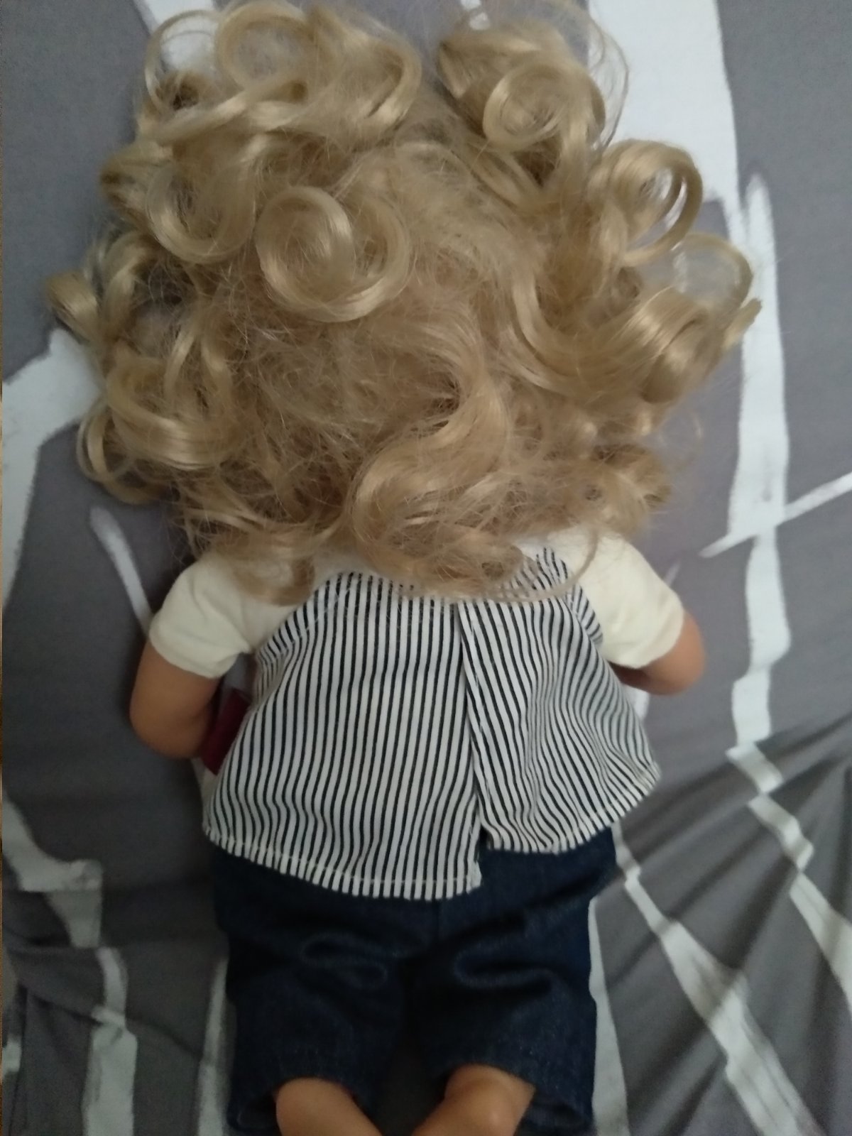 Pekná bábika. Bruško mäkké, látkové, končatiny gumené. Očká žmurkaju. Vlásky vzadu treba rozčesat - idee to dobre .Výška cca 33 cm.