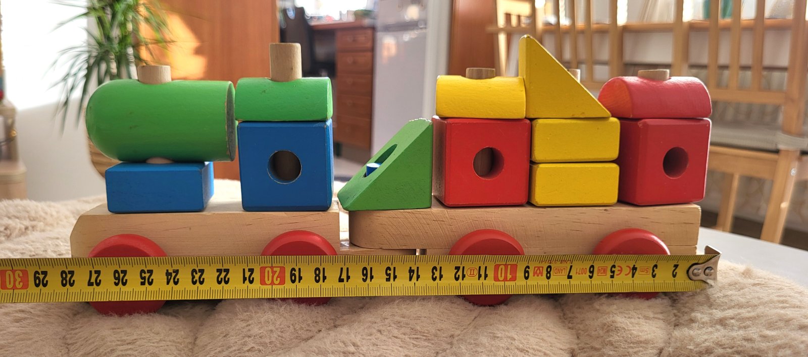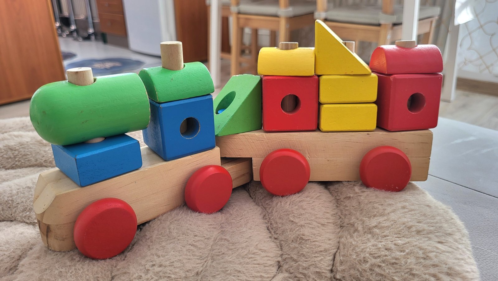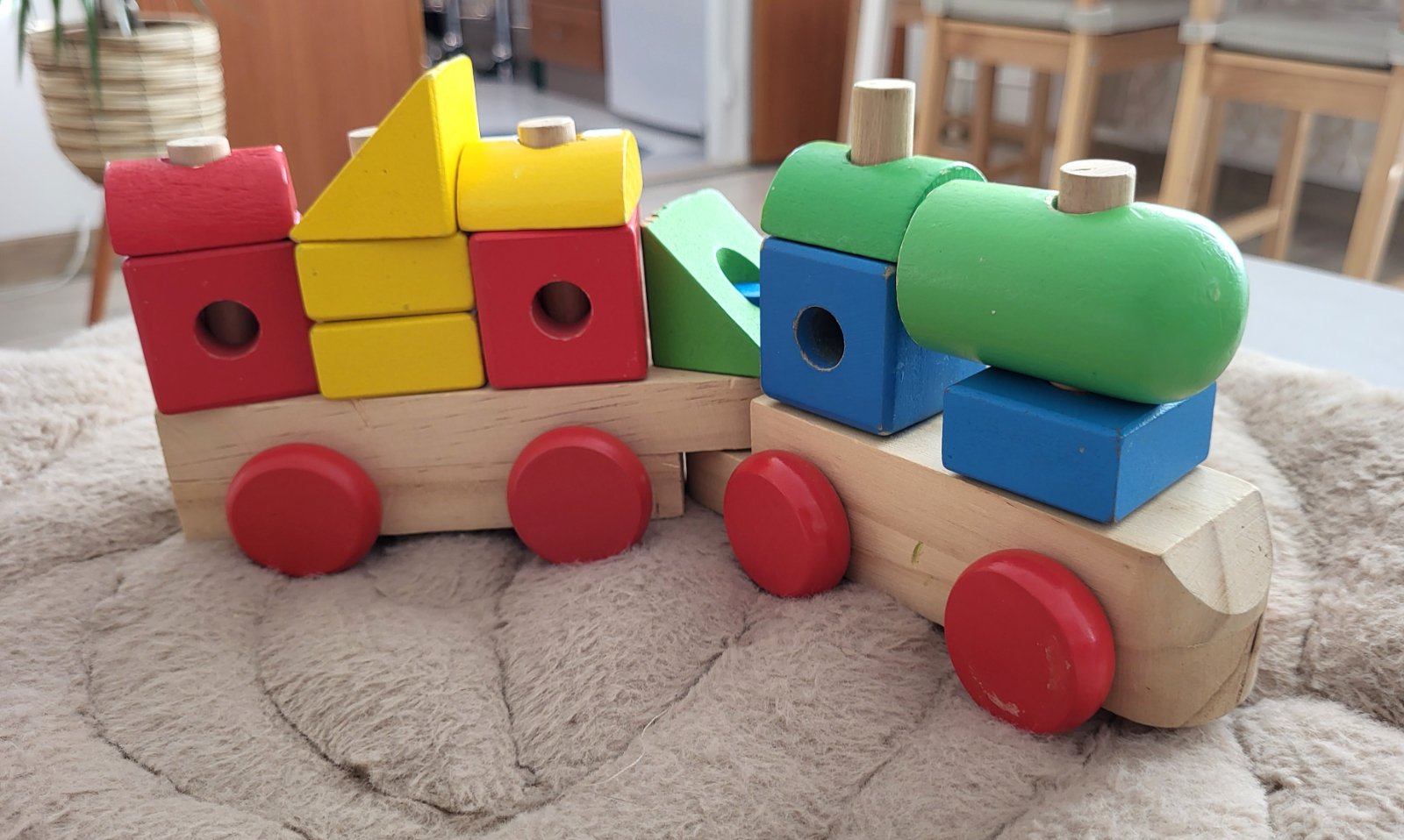 dobrý stav, má oškreninky no ok, je navrhnutá tak, aby pomáhala deťom rozvíjať jemnú motoriku, rozpoznávanie tvarov a farieb, je vyrobená z kvalitného masívneho dreva, obsahuje rušeň a jeden vagón, vďaka odnímateľným blokom funguje aj ako stavebnica, ktorú si deti môžu ľubovoľne preskladať na kolíkoch vagónu a rušňa. Často sa využíva aj ako dekorácia do detských izieb.
