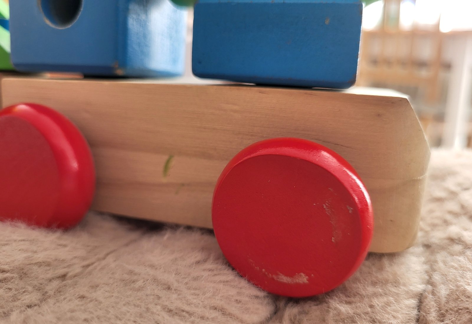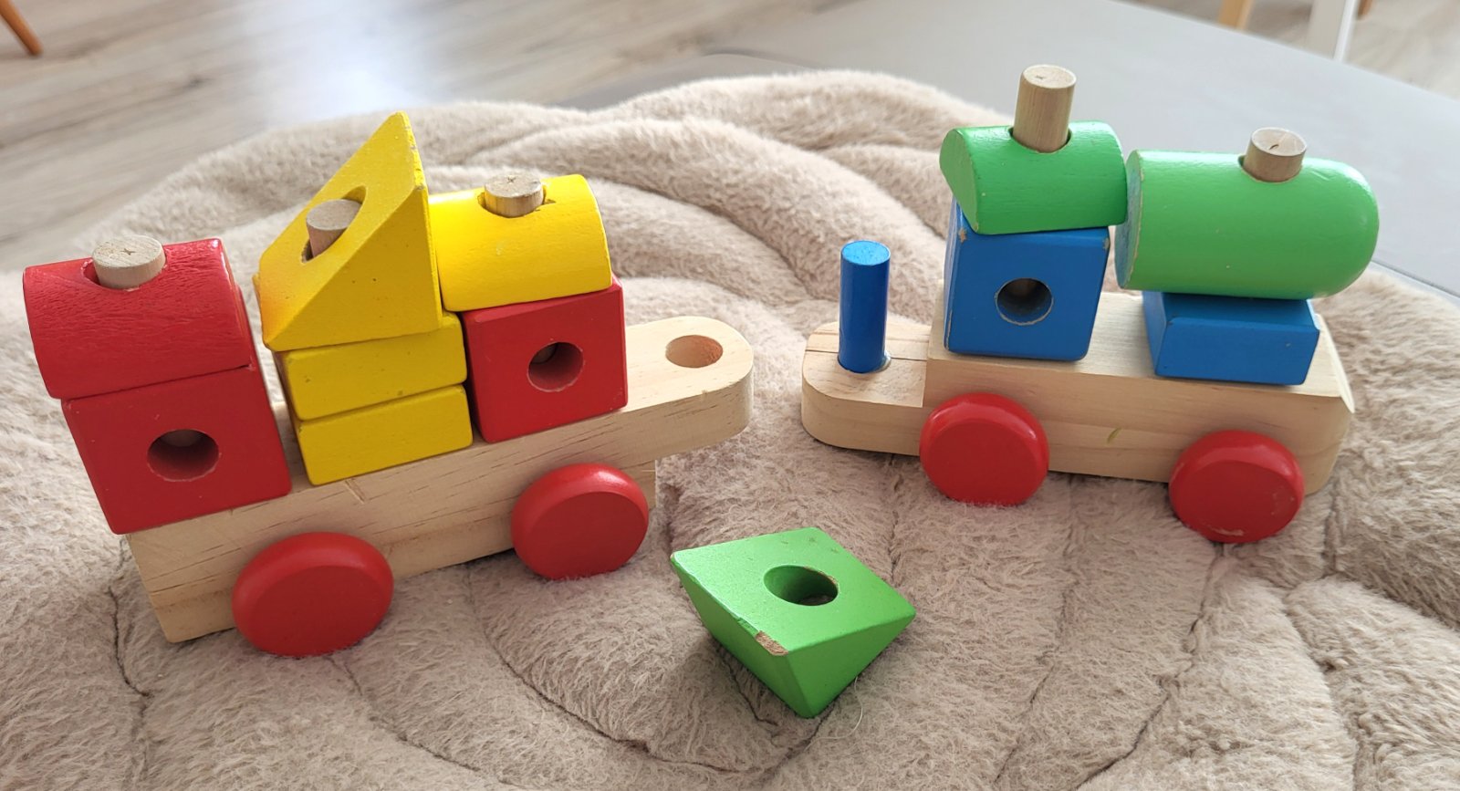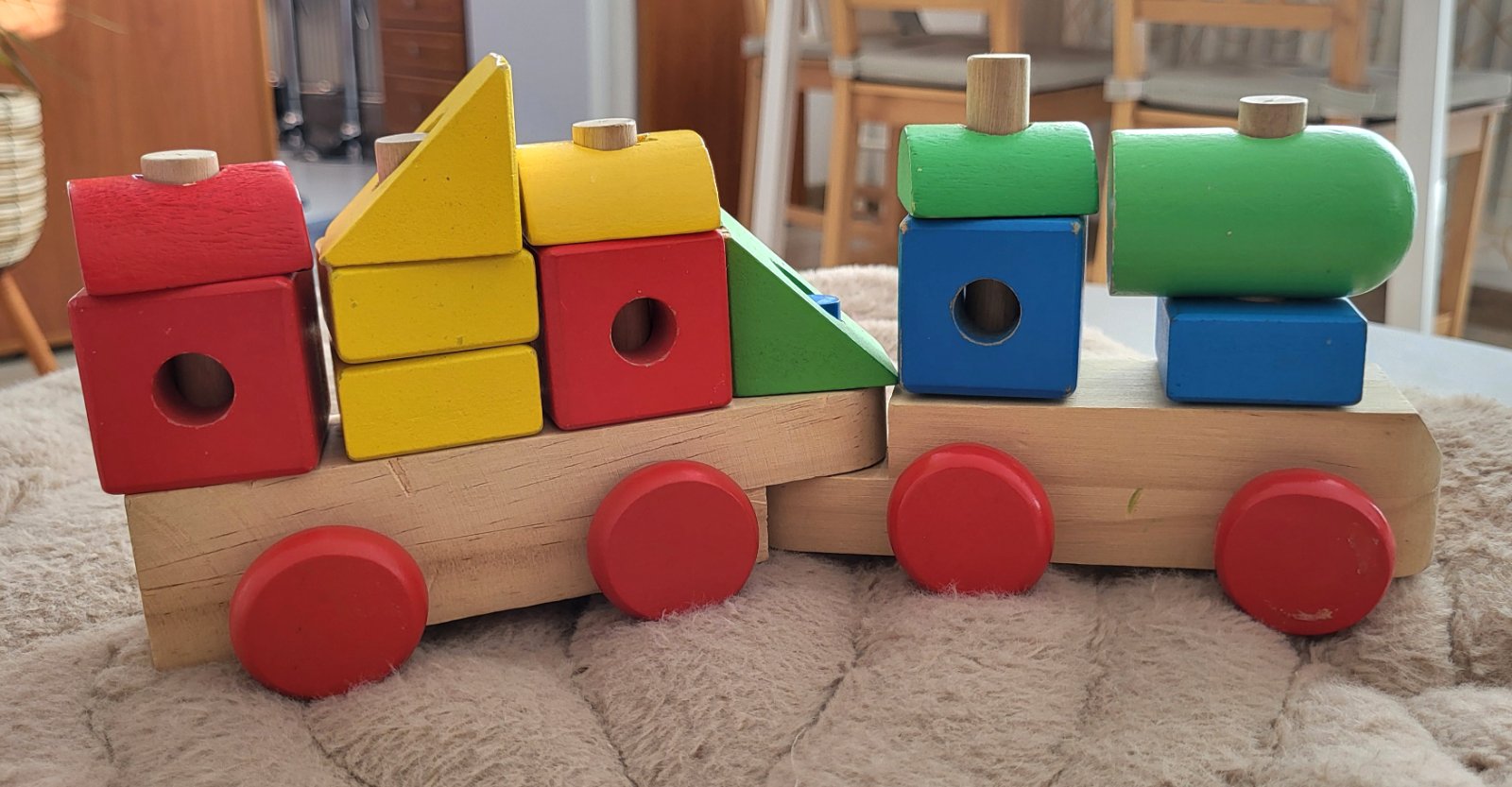 dobrý stav, má oškreninky no ok, je navrhnutá tak, aby pomáhala deťom rozvíjať jemnú motoriku, rozpoznávanie tvarov a farieb, je vyrobená z kvalitného masívneho dreva, obsahuje rušeň a jeden vagón, vďaka odnímateľným blokom funguje aj ako stavebnica, ktorú si deti môžu ľubovoľne preskladať na kolíkoch vagónu a rušňa. Často sa využíva aj ako dekorácia do detských izieb.