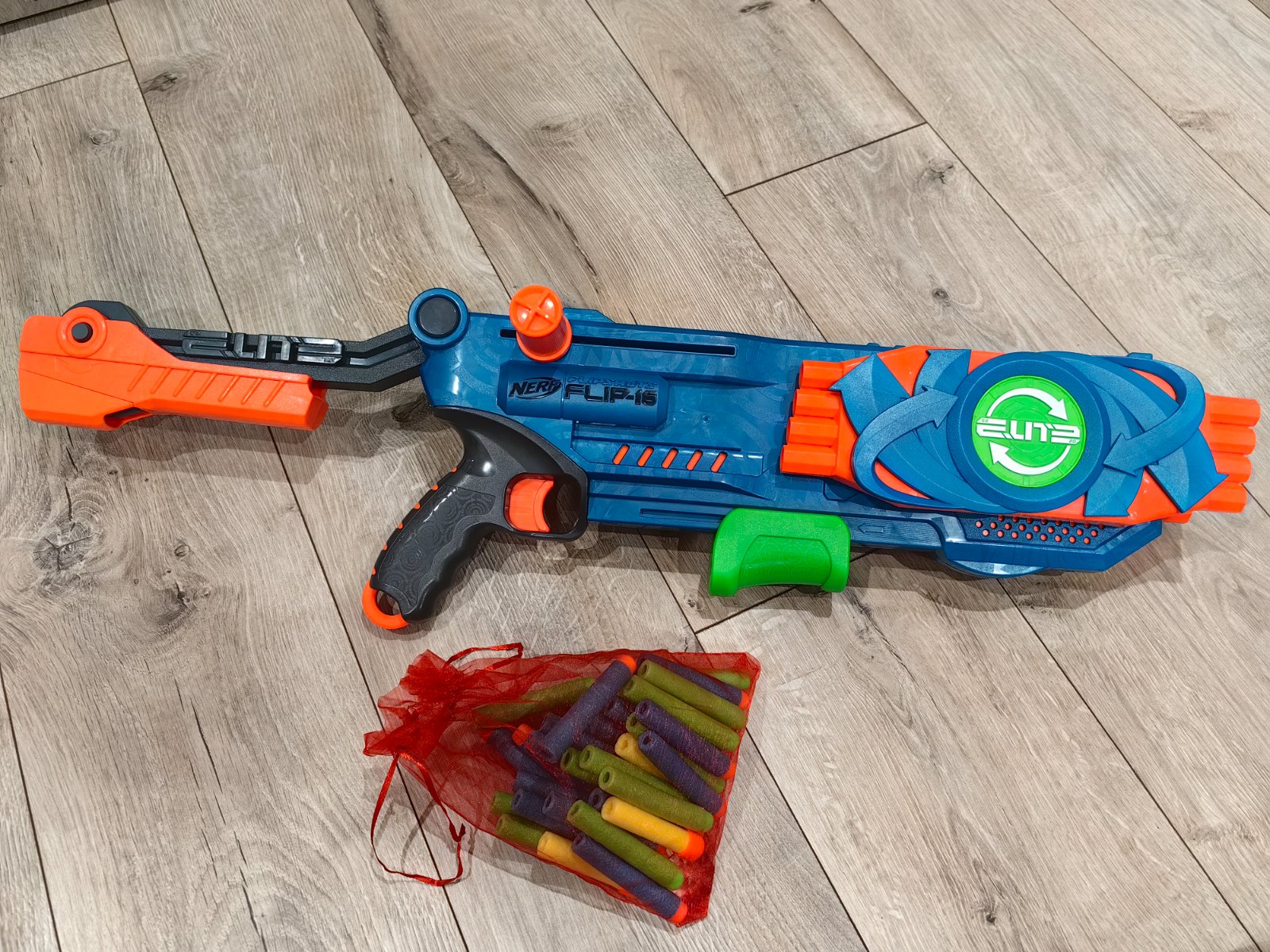 Vyrazte do boja s Nerf Elite 2.0 Flipshots Flip-16 Ballster! Blaster má 16 hlavní, 8 vpredu a 8 vzadu. Strieľajte šípy z 8 predných hlavní, potom otočte 8 zadných hlavní dopredu a pokračujte v streľbe. Keď si vaši súperi myslia, že ste mimo, môžete ich prekvapiť 8 šípkami navyše! Hlavne sú spojené, takže sa dajú rýchlo a jednoducho otáčať potiahnutím za rukoväť. Vystreľte 1 alebo 2 šípky naraz!