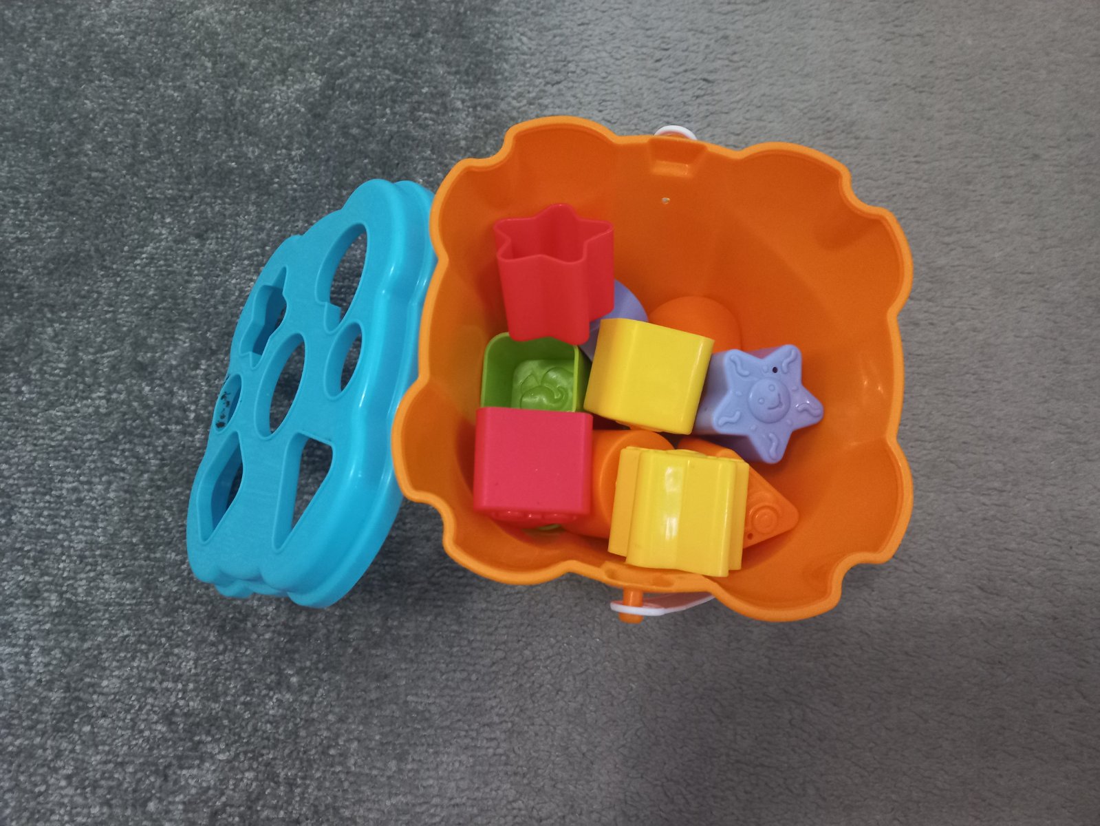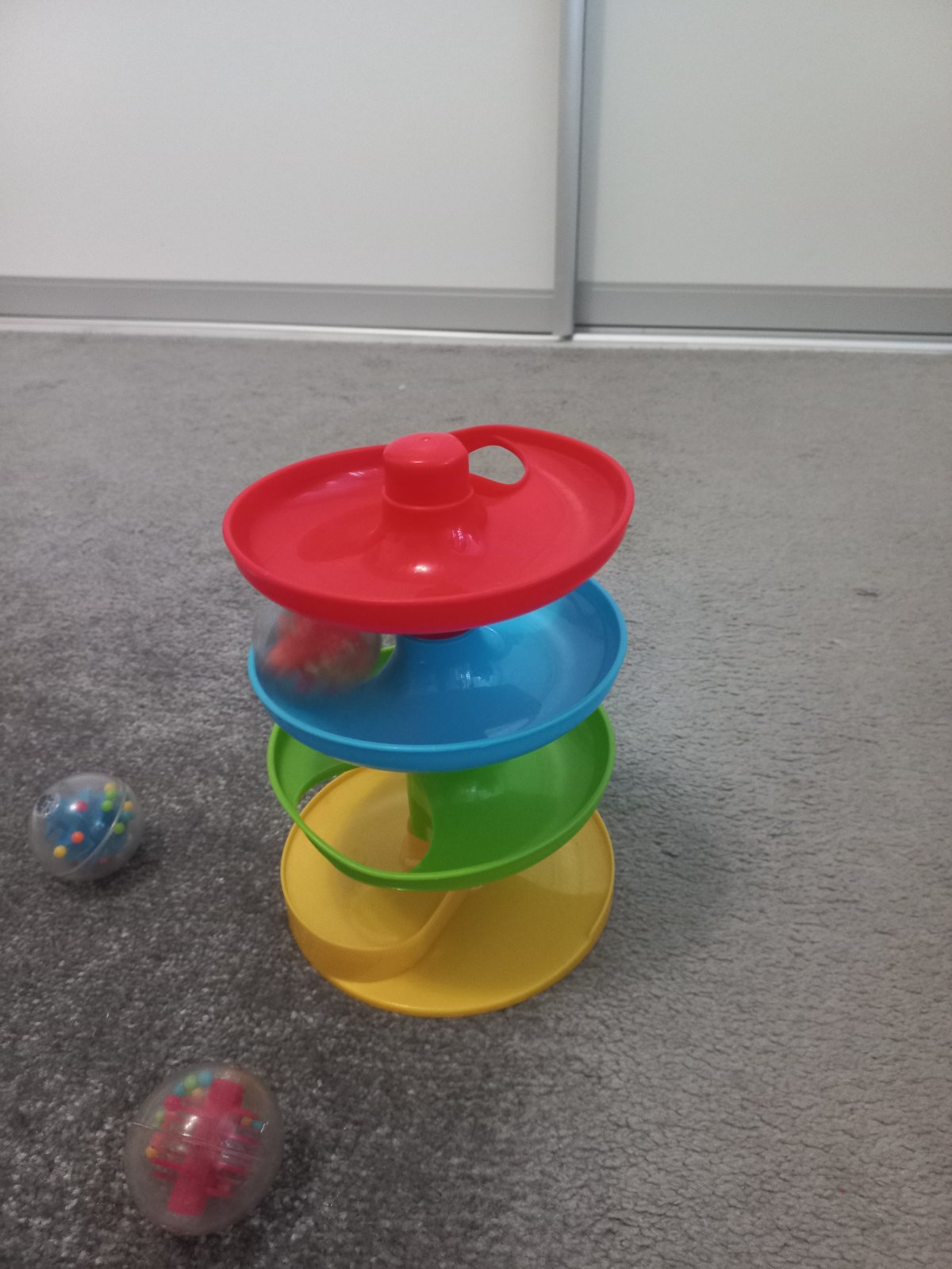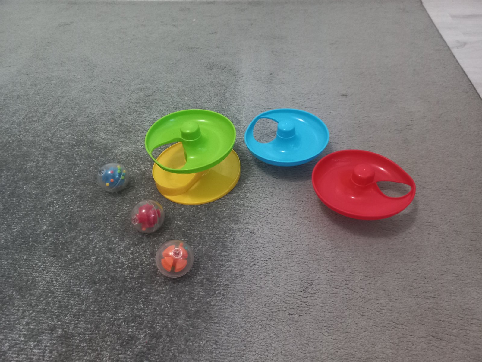 Guličková dráha obsahuje 3 guličky dráha sa dá rozložiť a zložiť v akomkoľvek poradí.Kíblik má vrchnák cez ktorý sa dajú prestrčiť kocky. Každá položka 4€.